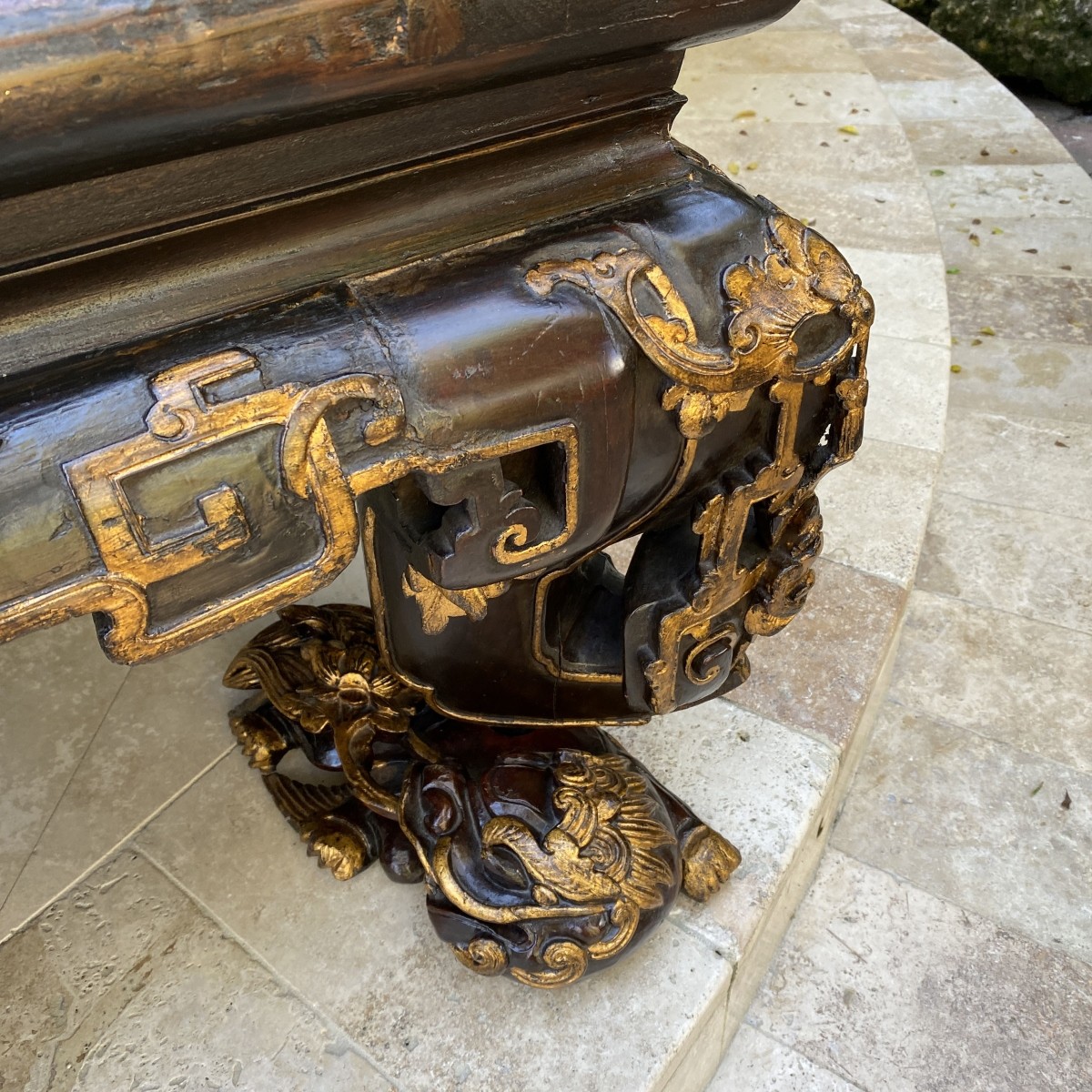 Mid 20th Century Chinese Carved Polychrome and Gilt Coffee Table. Elaborate detail work and stands on removable foo dog feet. Measures 20" x 28" x 72". Condition: Some typical splits, rubbing overall good condition. Estimate: $1000.00 - $1500.00 Domestic Shipping: Third party