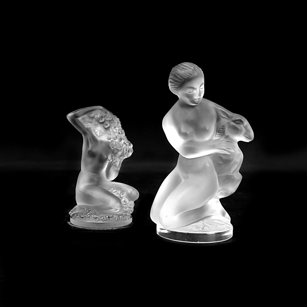 Grouping of Two (2) Lalique Crystal Kneeling Nude Figurines. Appropriately signed. Tallest measures 4-5/8", other measures 3-5/8". Condition: Good condition. Estimate: $50.00 - $150.00 Domestic Shipping: $45.00