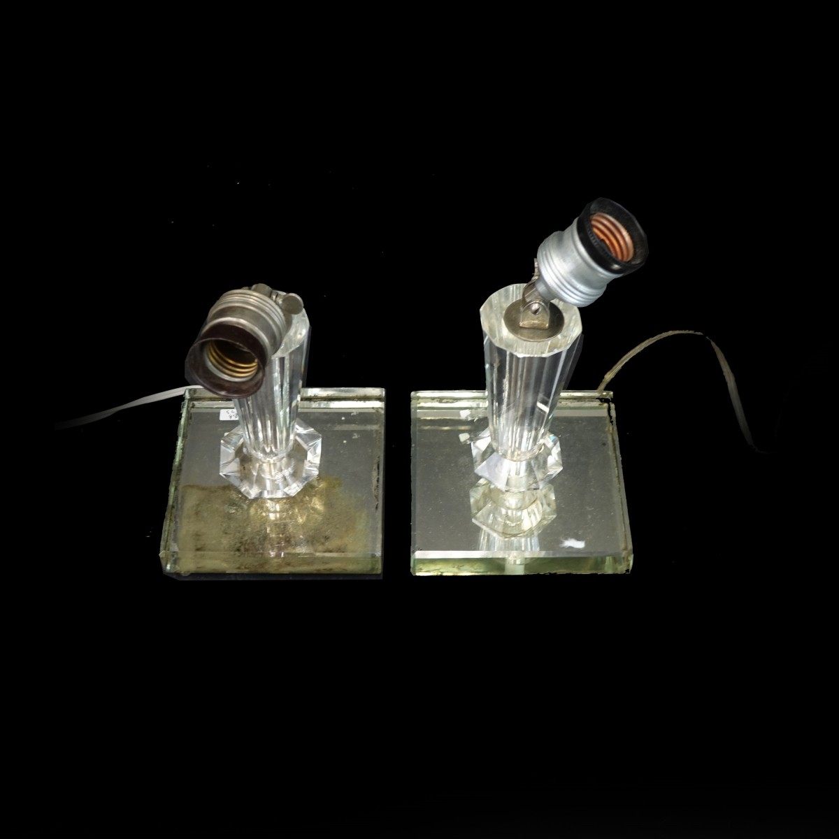 Pair of Vintage Art Deco Glass Lamps. Measures 9". Condition: One lamps has a chip to the stem, spotting to mirrored base or else good condition. Estimate: $50.00 - $150.00 Domestic Shipping: $88.00