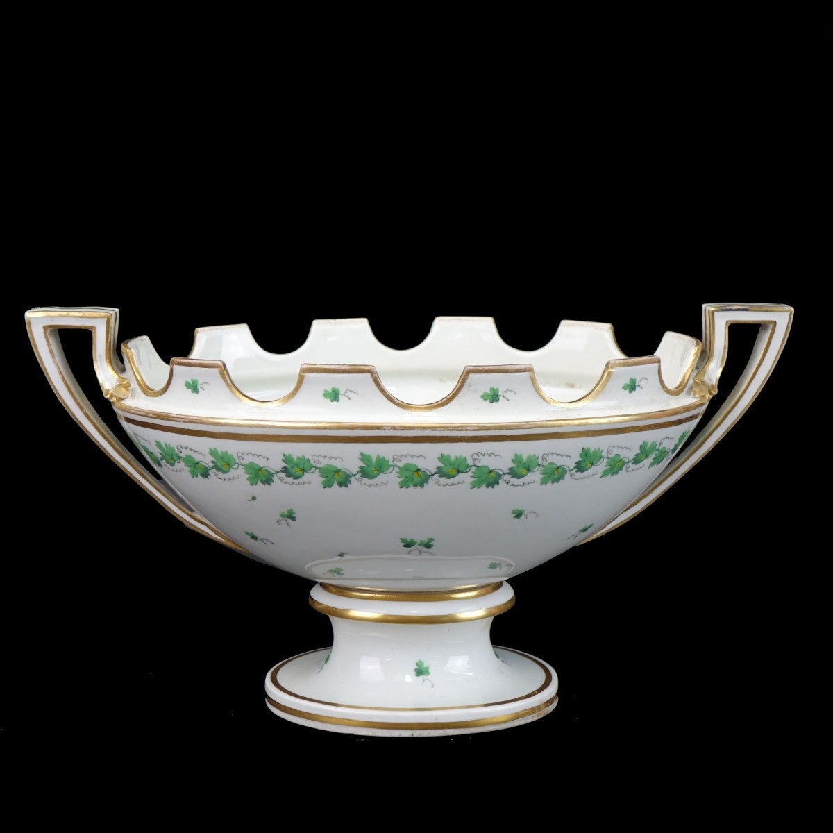 Vintage Continental Porcelain Centerpiece with Handles. Appears to be signed on the bottom side. Measures 7-5/8" x 14-1/4". Condition: Rubbing to the gilt otherwise good condition. Estimate: $50.00 - $150.00 Domestic Shipping: $95.00