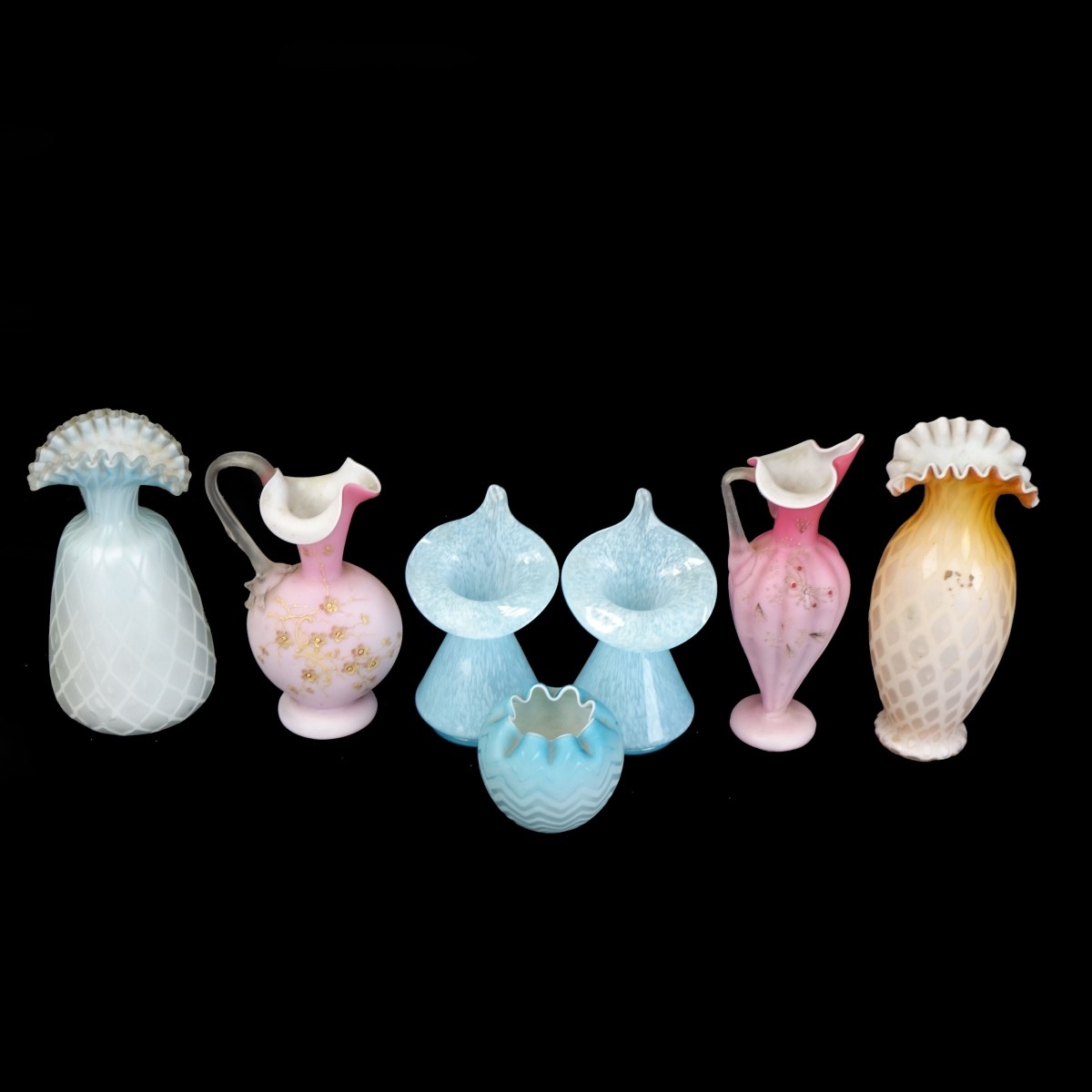 Grouping of Seven (7) Vintage Assorted Art Glass Vases. Unsigned. Tallest measures 9-1/2", smallest measures 3-1/2". Condition: Good condition. Estimate: $50.00 - $100.00 Domestic Shipping: Third party