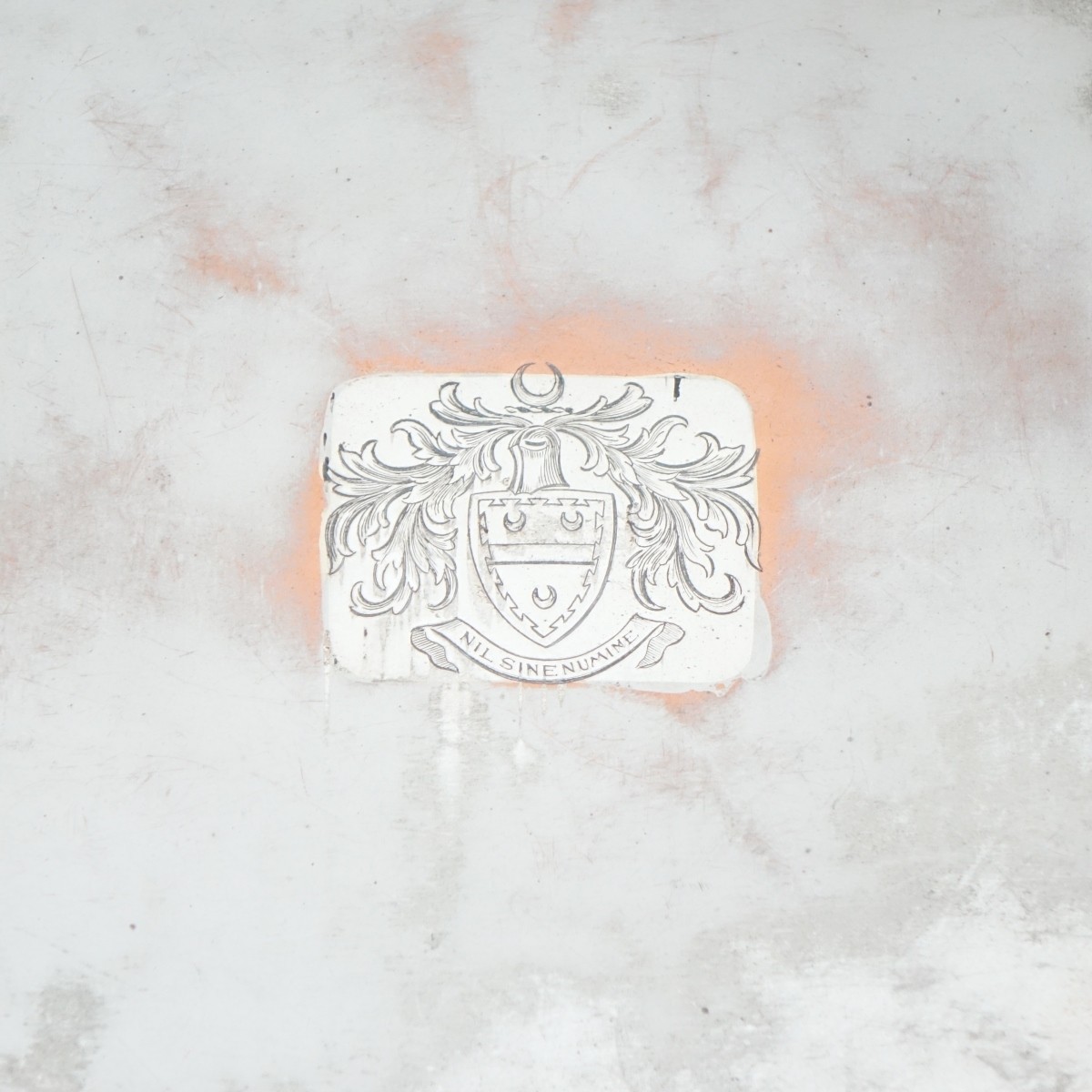 Large Antique English Silverplate Tray. Bears coat of armor with motto 'Nil Sine Numine". Measures 26" x 16-1/2". Condition: Good antique condition. Rubbing and wear consistent with age and normal use. Estimate: $50.00 - $100.00 Domestic Shipping: $125.00