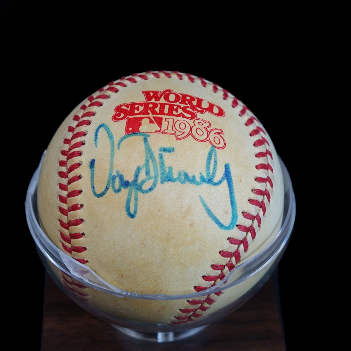 Darryl Strawberry Hand Signed Baseball in Display Stand. Official ball 1986 World Series. Measures 4-1/4" x 3" (w/stand). Condition: Good condition. Estimate: $50.00 - $100.00 Domestic Shipping: $36.00