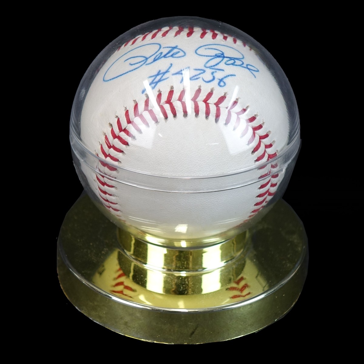 Pete Rose Hand Signed Baseball in Display Stand. Official Babe Ruth league baseball. Measures 4" x 3-5/8". Condition: Good condition. Estimate: $50.00 - $100.00 Domestic Shipping: $36.00