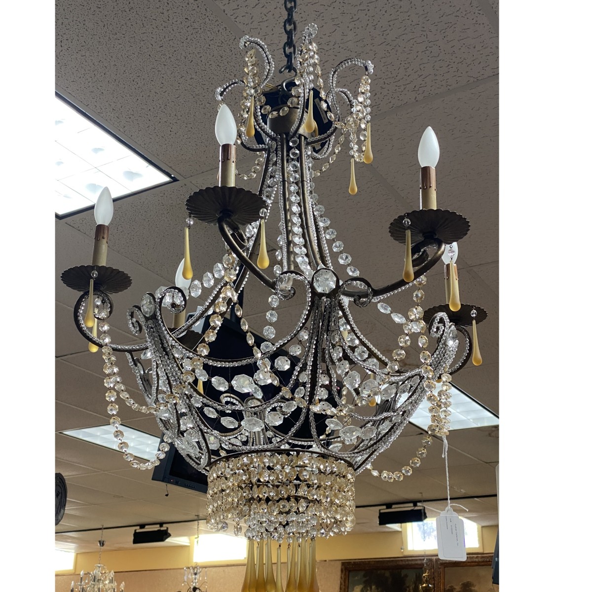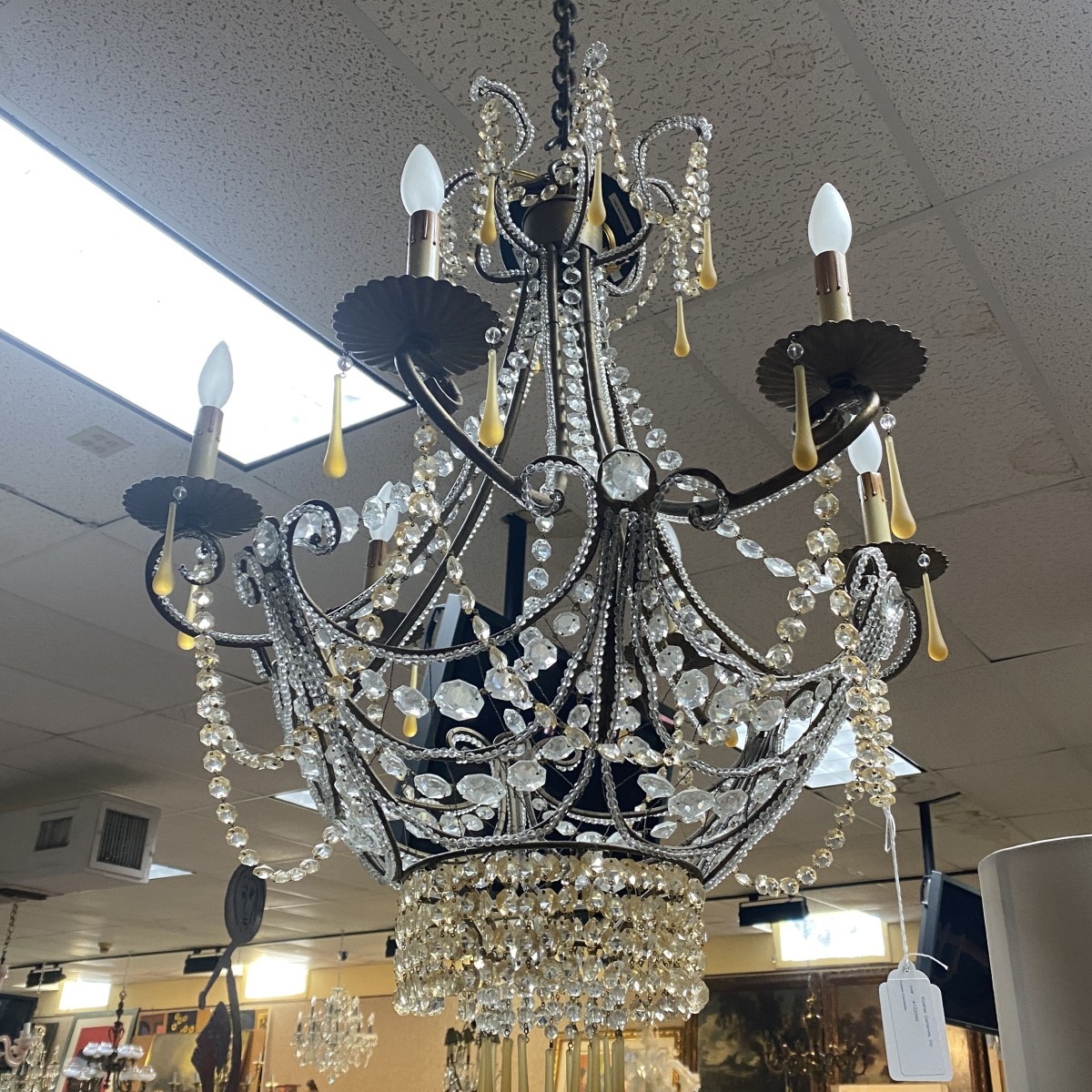 Early 20th Century Clear and Amber Beaded Six Light Chandelier, Possibly Italian. Gilt painted iron frame. Measures approx. 38" H, 30" W. Condition: Good vintage condition. Estimate: $400.00 - $800.00 Domestic Shipping: Third party