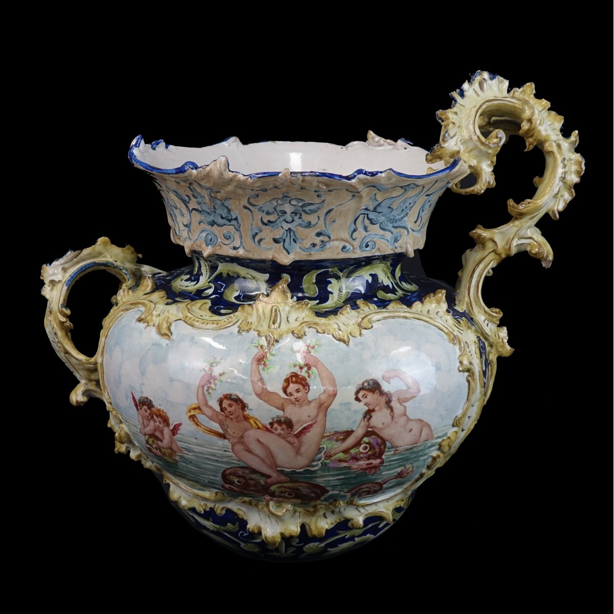 Large Majolica Terracotta Urn. Decorated with nude figural scenes on front and reverse. Measures 14-3/4" x 16". Condition: Missing base, losses and possible repairs otherwise good condition. Estimate: $150.00 - $250.00 Domestic Shipping: Third party