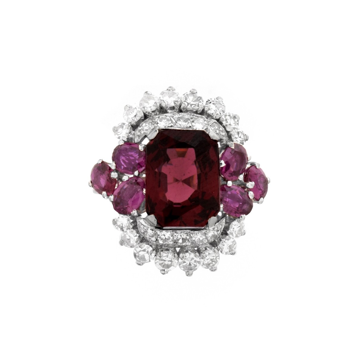 Art Deco Emerald Cut Rubelite, Approx. 1.50 Carat Old European Cut Diamond and Platinum Ring Further Accented with Six Oval Cut Tourmalines. Rubelite with vivid color, measures 10.5 x 8.0mm. Diamonds G-H color, VS1 clarity. Ring size 5-1/2. Approx. weight: 7.93 grams. Condition: Very good antique condition. Estimate: $3000.00 - $5000.00 Domestic Shipping: $28.00