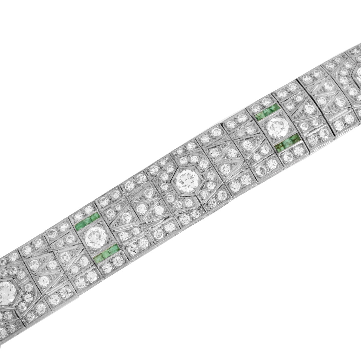 Art Deco Approx. 15.0 Carat TW Old European Cut Diamond, French Cut Emerald and Platinum Bracelet. Diamonds F-G color, VS1-VS2 clarity. Measures 7" L, 5/8" W. Approx. weight: 45.93 grams. Condition: Very good antique condition. For additional information and/or WhatsApp video please contact our resident GIA Graduate Gemologist, Russ Kodner at 954.650.5030 Estimate: $16,000.00 - $20,000.00 Domestic Shipping: $30.00