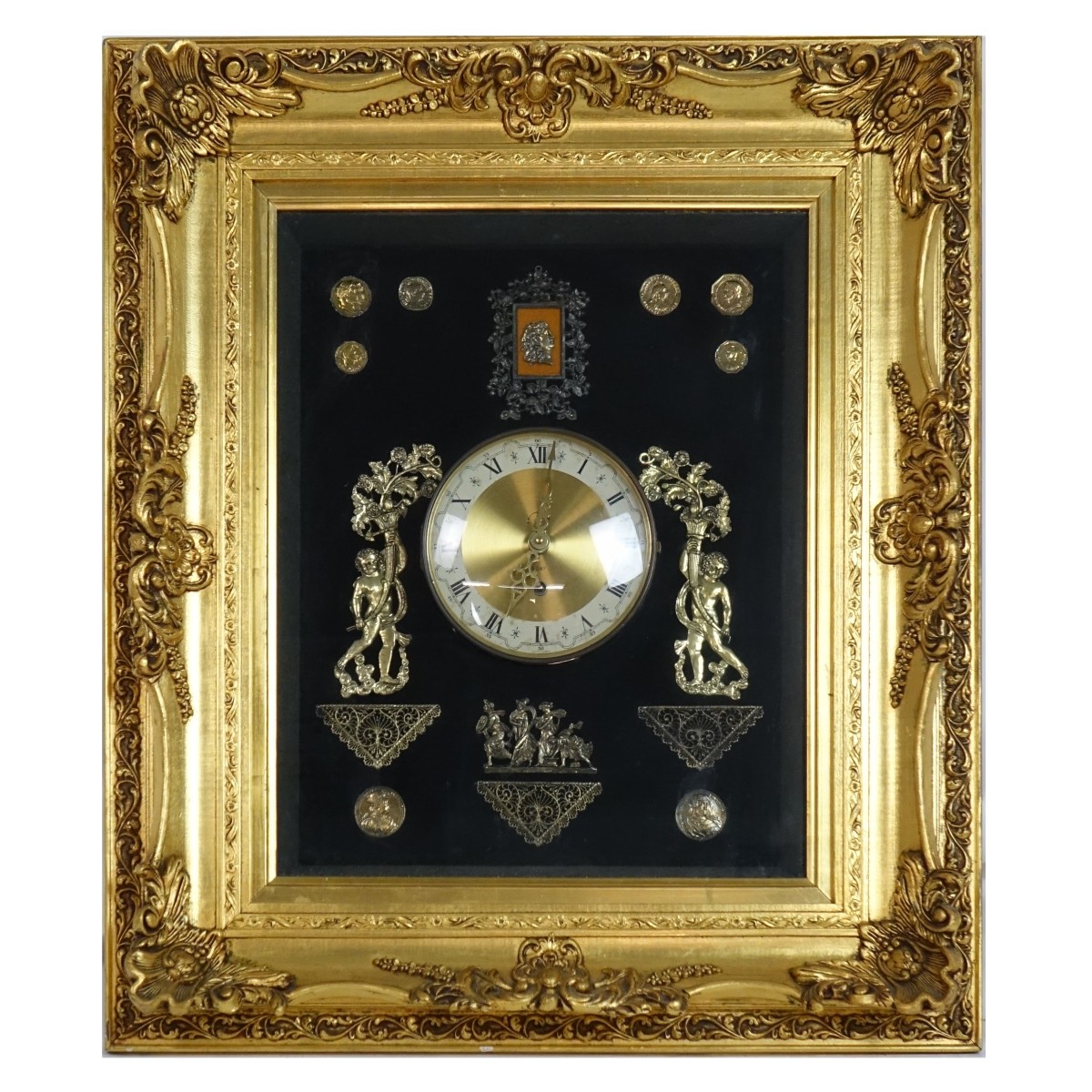 Vintage German 8 Day Clock and Assorted Brass Embellishments in Shadow Box Frame. Measures 19-1/2" x 15-1/2", frame measures 30" x 25-5/8". The gallery does not warranty the running condition of clocks. Condition: No key, appears to not be running otherwise good codnition. Estimate: $200.00 - $500.00 Domestic Shipping: Third party