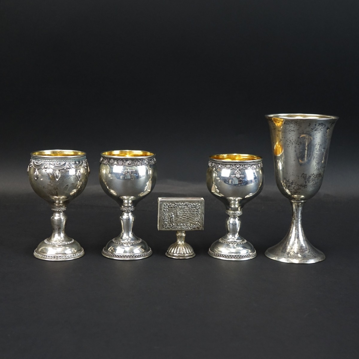 Grouping of Five (5) Sterling Silver Tableware. Lot consists of three Shevach Bros. ornate chalices, Mueck-Cary Co. Inc chalice and footed match holder. Signed. Tallest chalice measures 6-5/8", other chalices measure 4-3/4". Total weight weighs approx. 14.50 troy ounces. Condition: Needs a routine cleaning. Estimate: 200.00 - $400.00 Domestic Shipping: $66.00