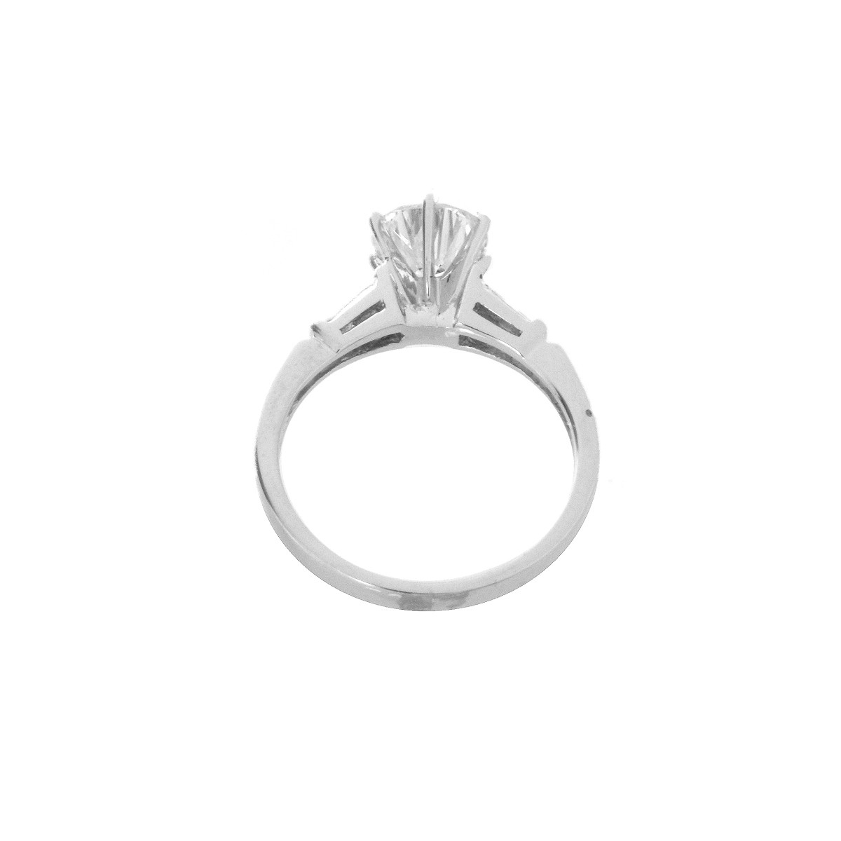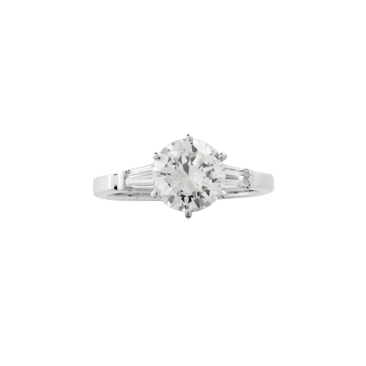 GIA Certified 1.39 Carat Round Brilliant Cut Diamond and 18 Karat White Gold Engagement Ring Accented with Two Tapered Baguette Diamonds. Center diamond H color, SI2 clarity. Stamped 18K. Ring size 6-1/2. Approx. weight: 3.7 grams. GIA Report 5202917015 dated 2/14/2020 to accompany this Lot. Condition: Very good condition. Estimate: $3000.00 - $5000.00 Domestic Shipping: $30.00