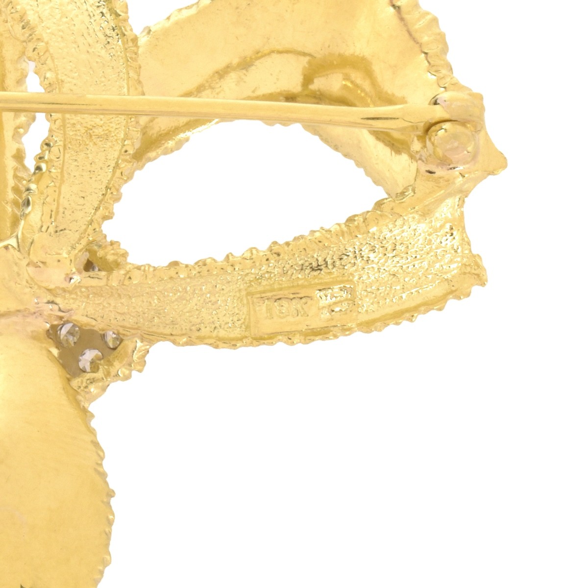 Vintage Approx. .25 Carat TW Fourteen Round Cut Diamond and 18 Karat Yellow Gold Bow Brooch. Stamped 18K. Measures 1-7/8" x 1-1/2". Approx. weight: 14.91 grams. Condition: Very good condition. Estimate: $600.00 - $800.00 Domestic Shipping: $30.00