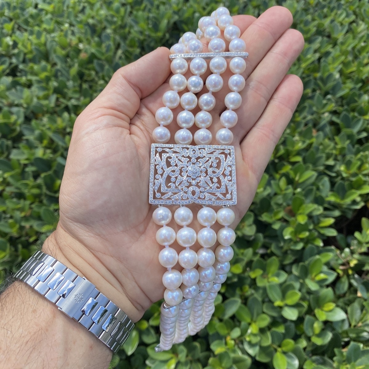 Edwardian style Round Brilliant Cut Diamond, 10.0mm White Pearl and 18 Karat White Gold Four Strand Choker Necklace. Diamonds E-F color, VS1-VS2 clarity. Pearls good luster and polish, minor natural blemished. Measures 14-3/4" L, 1-7/8" W. Approx. weight: 208.12 grams. Condition: Very good condition. For additional information and/or WhatsApp video please contact our resident GIA Graduate Gemologist, Russ Kodner at 954.650.5030 Estimate: $5000.00 - $7000.00 Domestic Shipping: $32.00