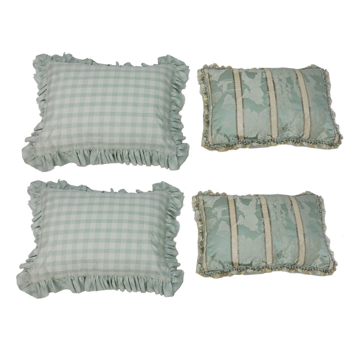 Four Custom Made Decorative Pillows. Larger (plaid) measure 28" W, 20" H (plus 3" flange) Condition: Very good pre-owned condition. Estimate: $50.00 - $150.00 Domestic Shipping: $115.00