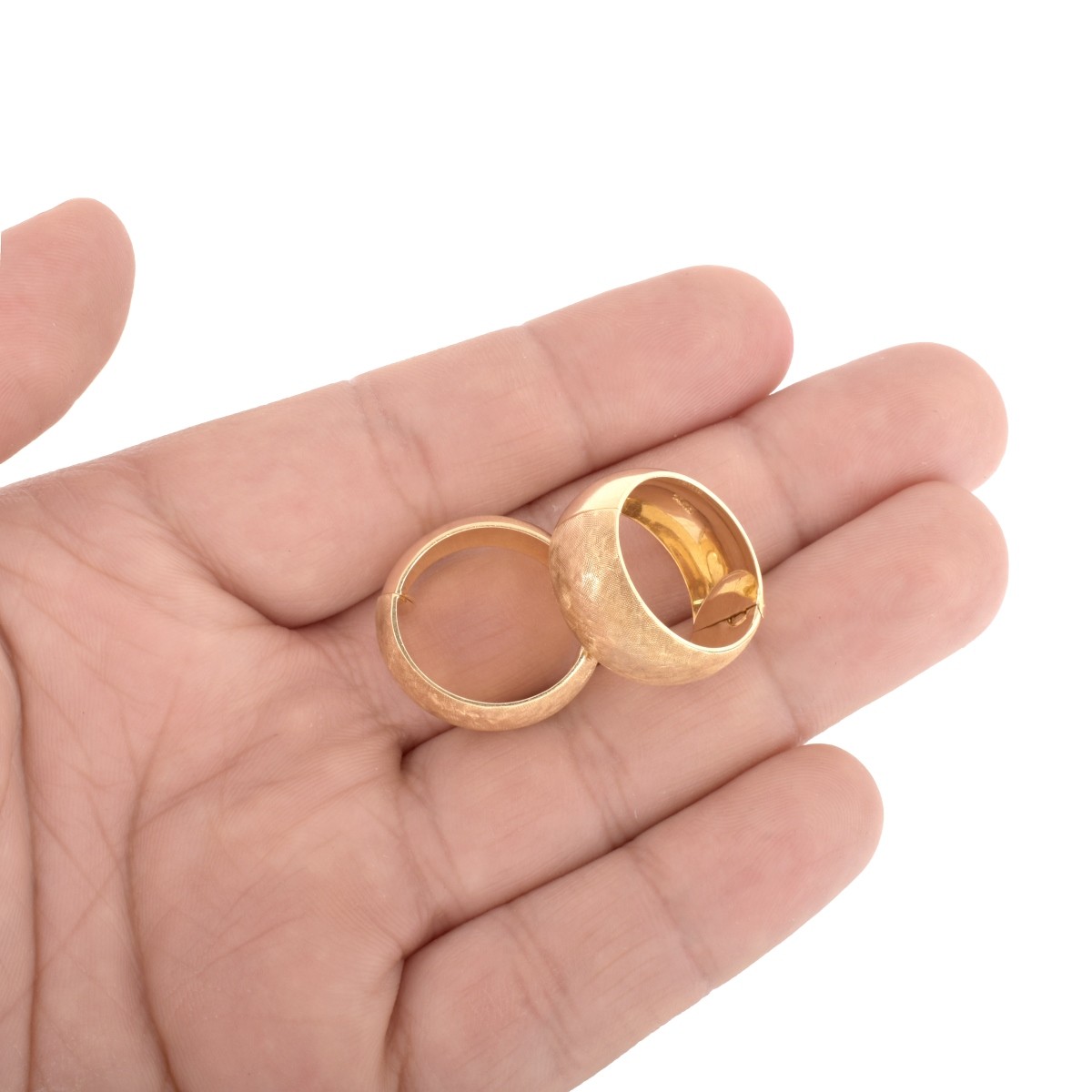 Vintage 14 Karat Yellow Gold Reversible Huggy Hoop Earrings. One side bright polish, the other textured. Stamped 14K. Measure 3/8" W, 5/8" interior diam. Approx. weight: 9.17 grams. Condition: Very good condition. Estimate: $250.00 - $450.00 Domestic Shipping: $30.00