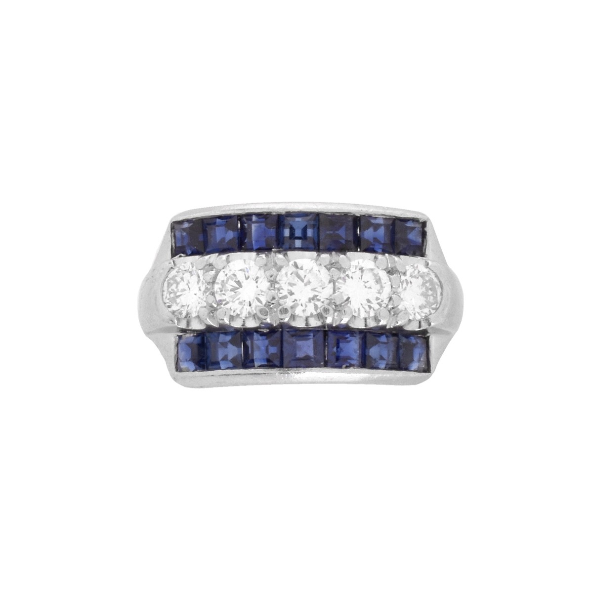 Vintage Approx. .50 Carat TW Five Round Brilliant Cut Diamond, Caliber Cut Sapphire and Platinum Three Row Ring. Diamonds F-G color, VS1-VS2 clarity. Sapphires with vivid color. Stamped Plat. Ring size 4-1/2. Condition: Very good condition. For additional information and/or WhatsApp video please contact our resident GIA Graduate Gemologist, Russ Kodner at 954.650.5030 Estimate: $1000.00 - $2000.00 Domestic Shipping: $28.00