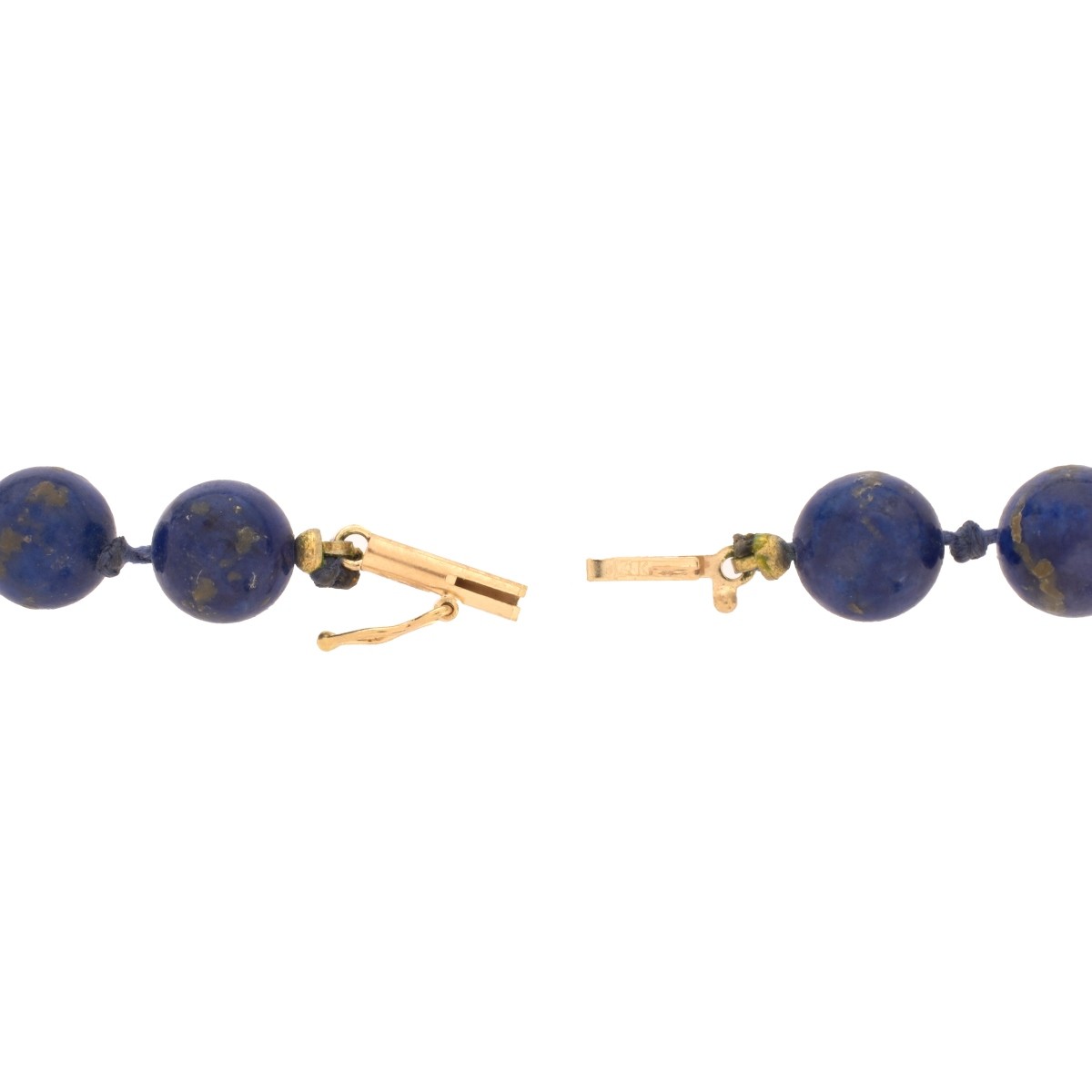 Vintage Single Strand Sixty Eight 8mm Lapis Lazuli Bead and 14 Karat Yellow Gold Necklace. Measures 27" L. Approx. weight: 54.46 grams. Condition: Very good condition. Estimate: $200.00 - $400.00 Domestic Shipping: $30.00