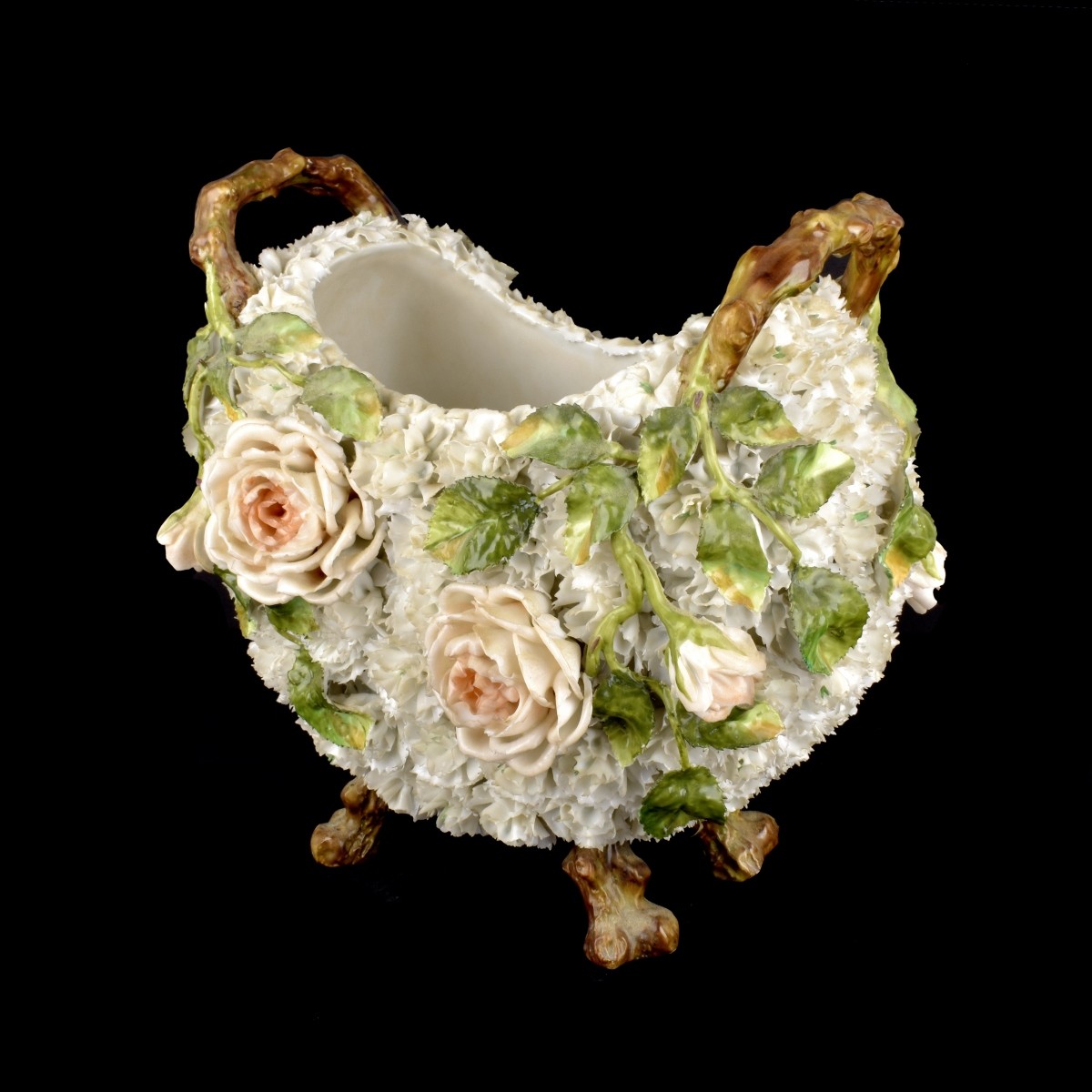 Large Dresden Porcelain Footed Floral Centerpiece with Handles. Unsigned. Measures 9-3/4" x 10". Condition: Chips and repairs to the flowers. Please examine before bidding. Estimate: $100.00 - $500.00 Domestic Shipping: Third party