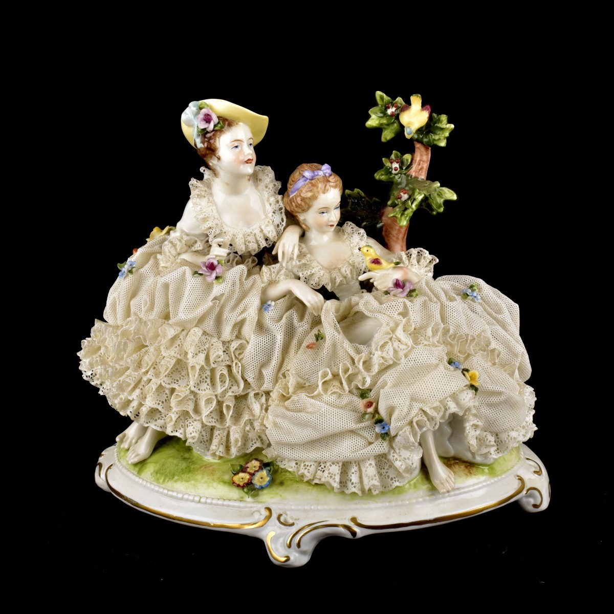 Antique Dresden Porcelain L;ace Figural Group. Signed and incised numbers to the base. Measures 8" x 9". Condition: Losses to the lace, chips to the flowers otherwise good condition. Estimate: $50.00 - $150.00 Domestic Shipping: Third party