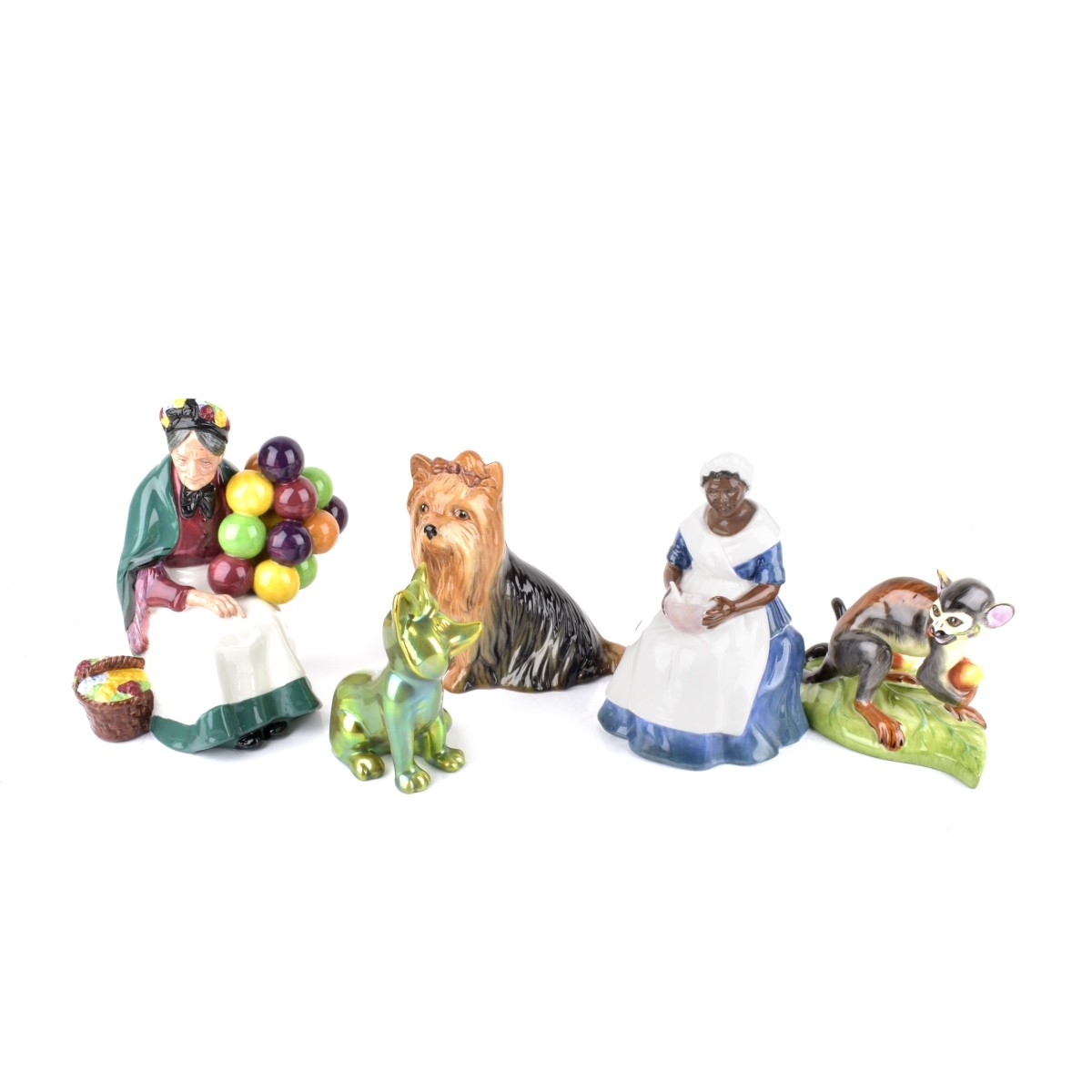 Grouping of Five (5) Vintage Assorted Porcelain Figures. Includes two Royal Doulton figures, Zsolnay iridescent fox, Hollohaza monkey figure, and a Sylvac Staffordshire Yorkshire figure. Tallest measures 7-1/2", smallest measures 4" x 6-1/4". Condition: Good condition. Estimate: $50.00 - $150.00 Domestic Shipping: $88.00