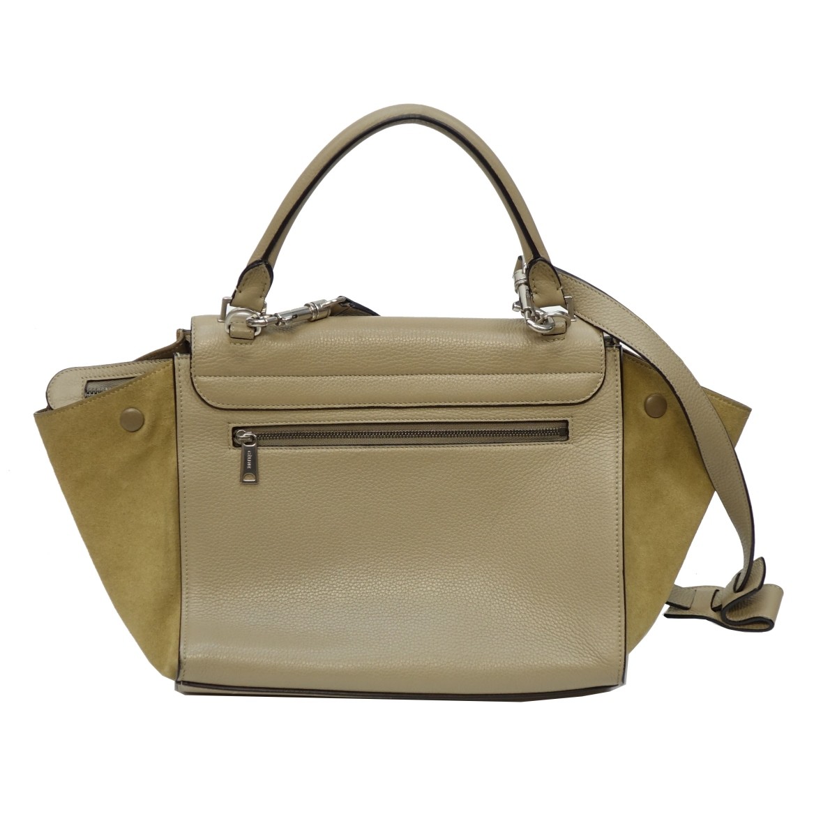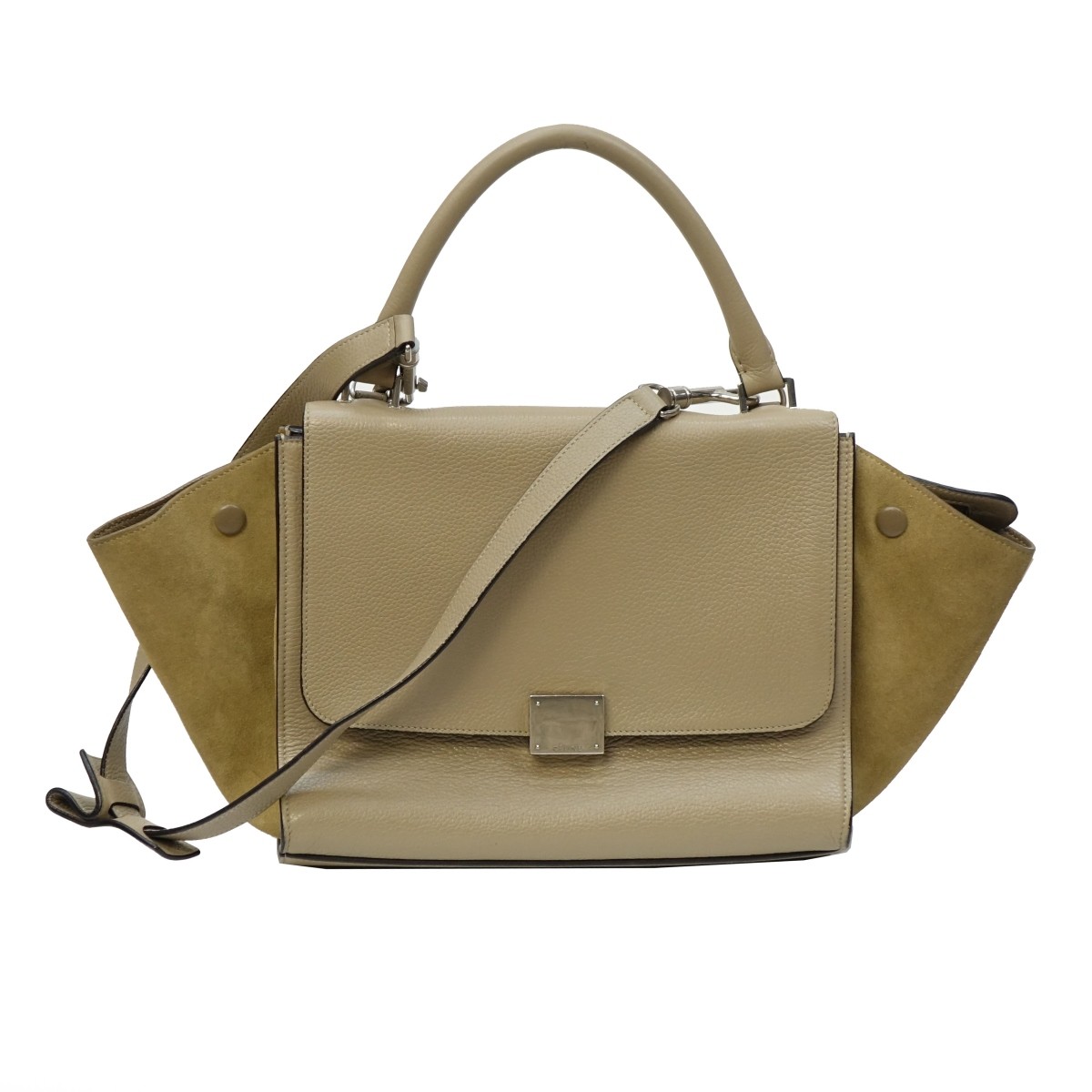 Celine Trapeze Leather and Suede Shoulder Bag. Serial number: F/VP/0144/F/MM/0144. Appropriately labeled. Silver tone hardware, Flap over and zipper closure. Interior having patch pockets and storage. Strap to accompany the lot. Measures 8" x 10-1/2". Condition: Good condition. Estimate: $300.00 - $600.00 Domestic Shipping: $72.00