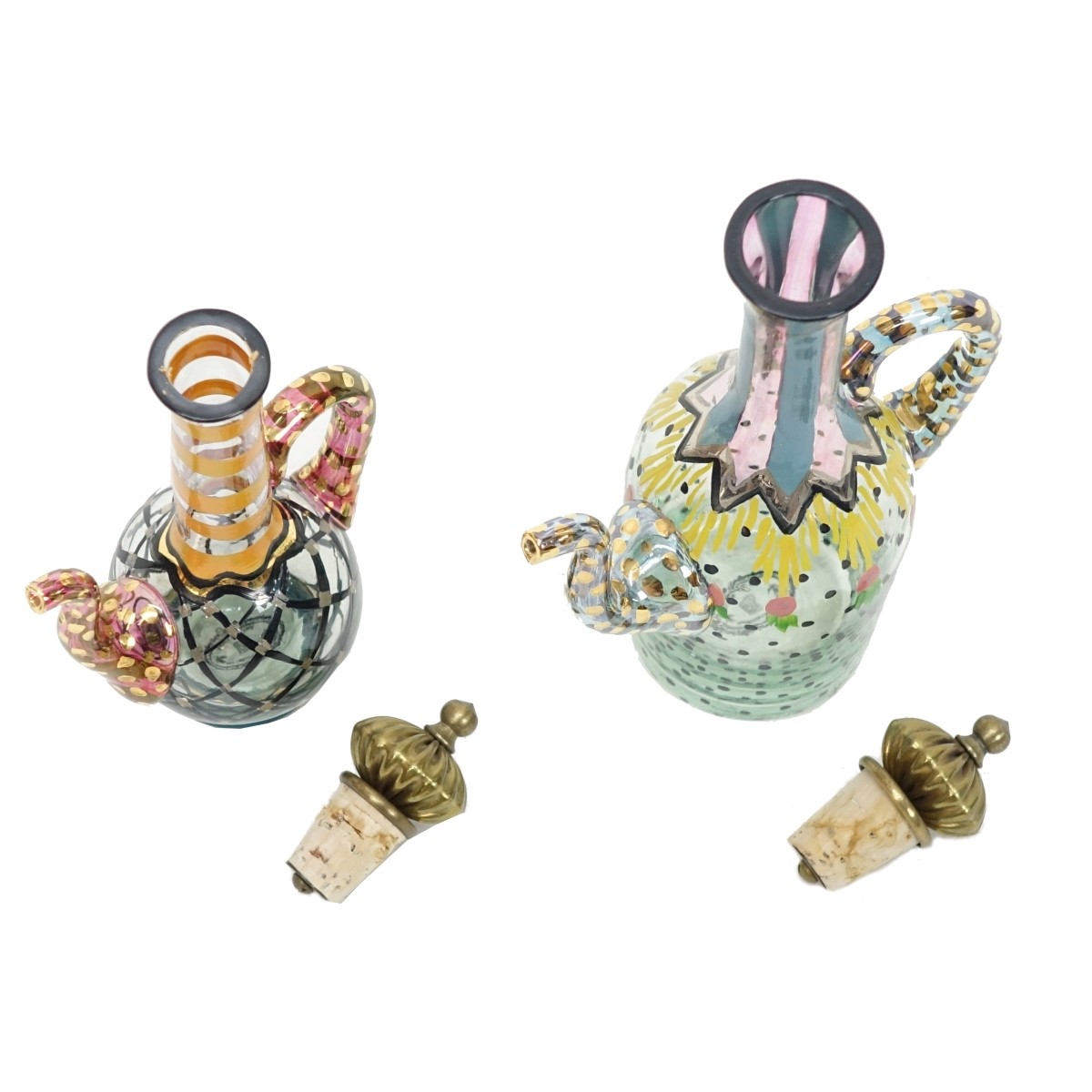 Mackenzie Childs Handpainted Glass Oil and Vinegar Cruets with Stoppers. Each bearing original labels. Tallest measures 8", other measures 7". Condition: Good condition. Estimate: $50.00 - $150.00 Domestic Shipping: $48.00
