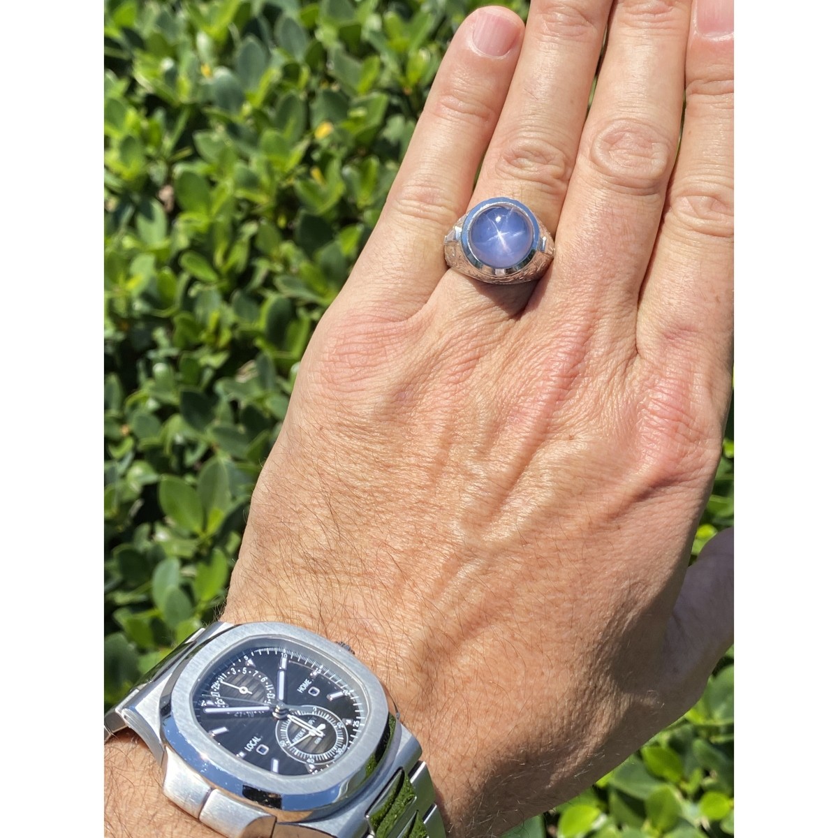 Man's Vintage Approx. 25.0 Carat Star Sapphire, .60 Carat TW Two Baguette Cut Diamond and 18 Karat White Gold Ring. Diamonds F-G color, VVS-VS clarity. Stamped 18K. Ring size 10-1/2. Approx. weight: 25.32 grams. Condition: Very good condition. For additional information and/or WhatsApp video please contact our resident GIA Graduate Gemologist, Russ Kodner at 954.650.5030 Estimate: $5000.00 - $7000.00 Domestic Shipping: $28.00