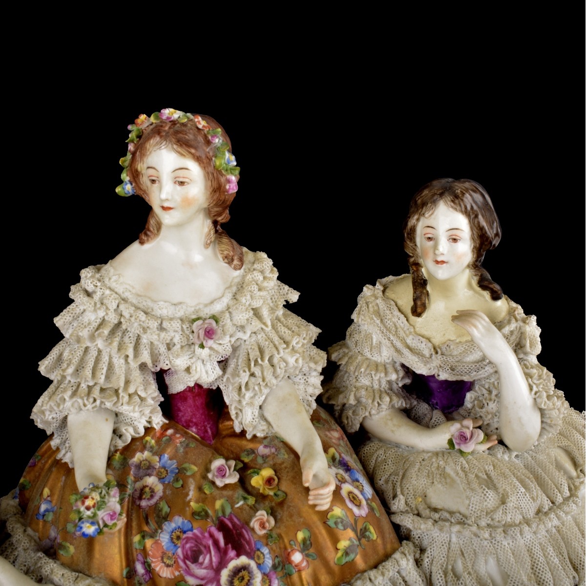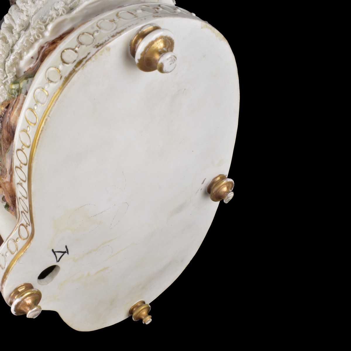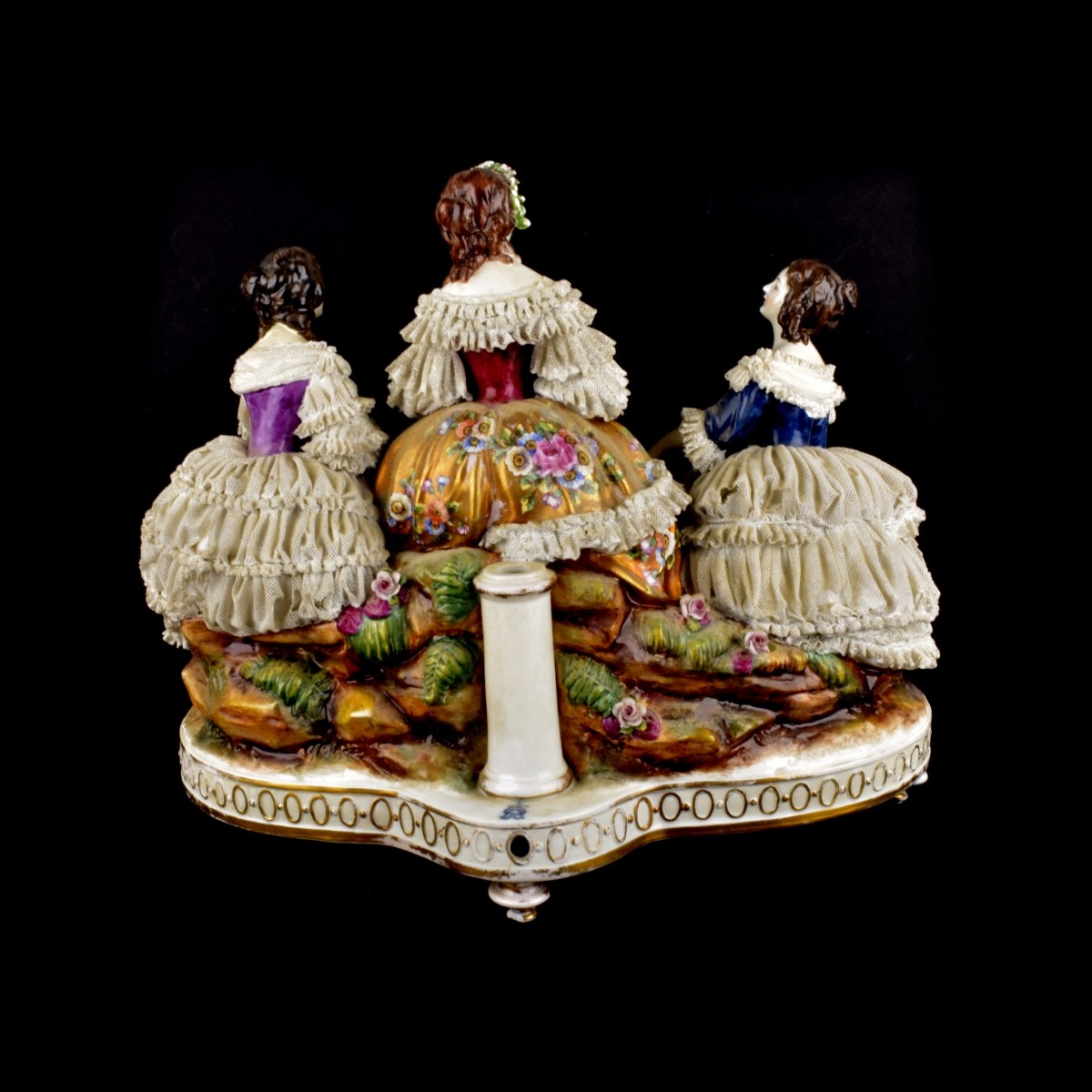 Large Antique Dresden Porcelain Lace Figural Group. Previously mounted as a lamp. Signed on reverse side. Measures 11-5/8" x 14". Condition: Some chips and losses. As Is condition. Please examine before bidding. Estimate: $200.00 - $500.00 Domestic Shipping: Third party