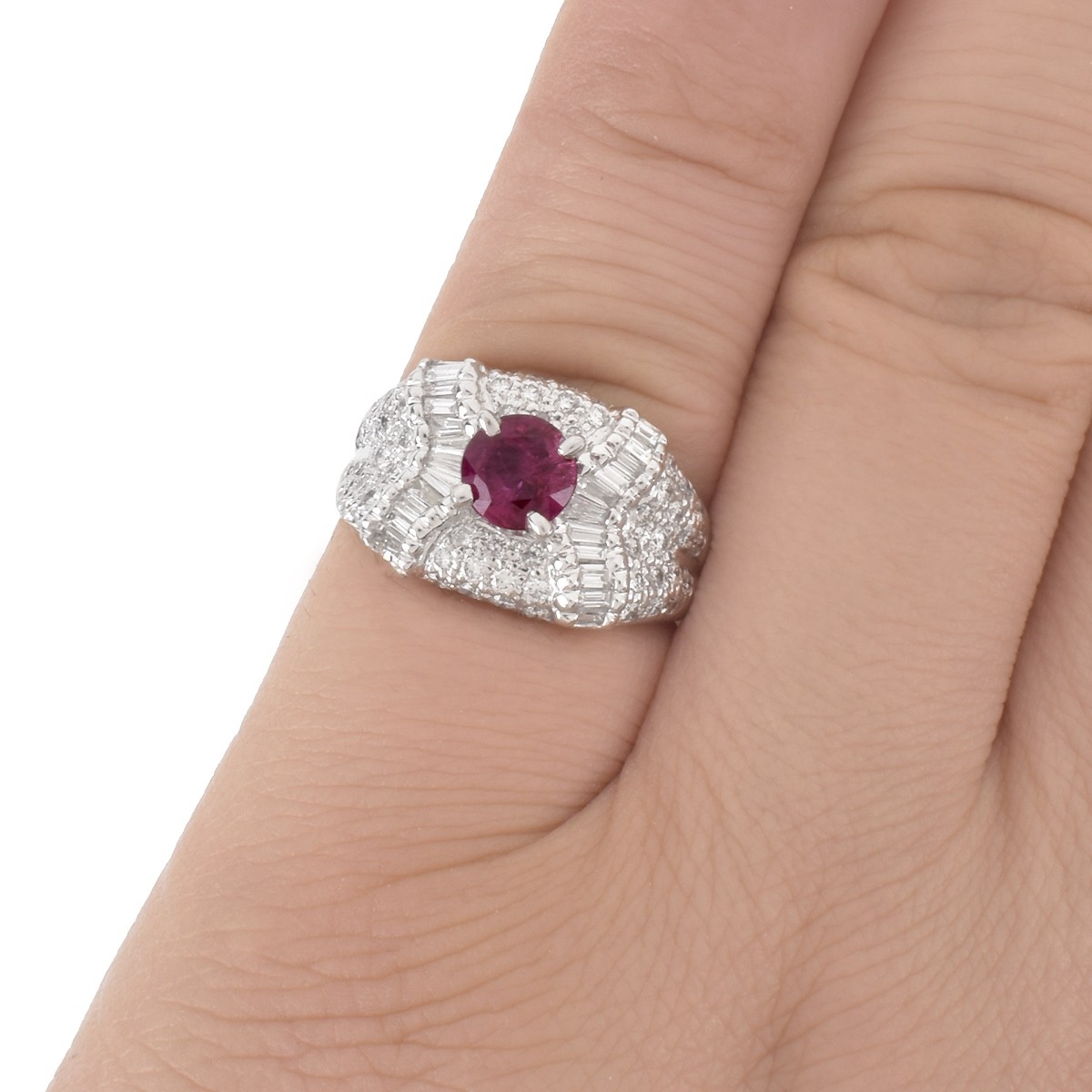Approx. 1.10 Carat Round Brilliant Cut Natural Ruby, 1.07 Carat TW Round Brilliant and Baguette Cut Diamond and Platinum Ring. Ruby with vivid color. Diamonds F-G color, VS clarity. Stamped Pt900. Ring size 6. Approx. weight: 10.49 grams. Condition: Very good condition. For additional information and/or WhatsApp video please contact our resident GIA Graduate Gemologist, Russ Kodner at 954.650.5030 Estimate: $1500.00 - $2500.00 Domestic Shipping: $28.00