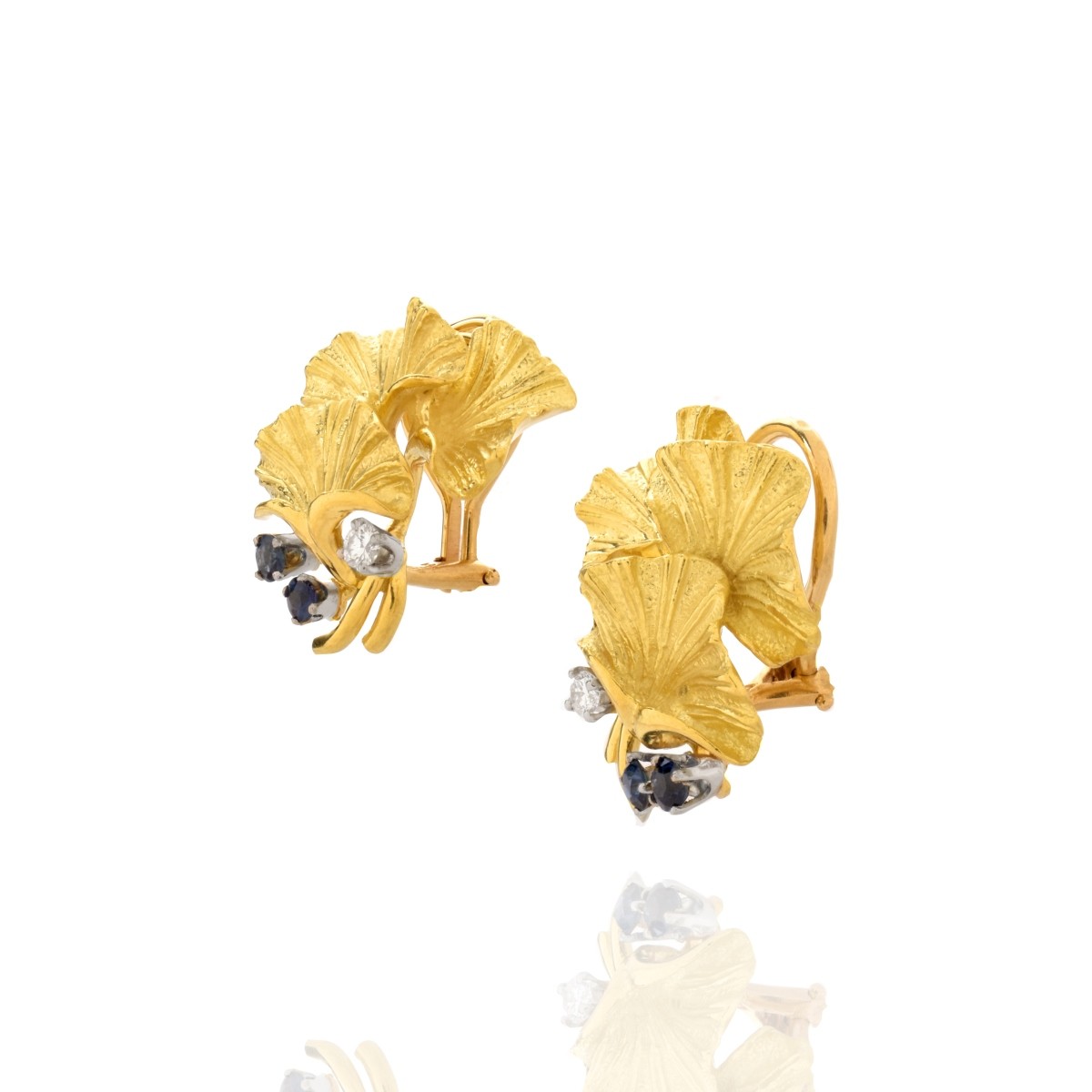 Vintage Sapphire, Diamond and 18 Karat Yellow Gold Gingko Leaf Clip Back Earrings. Sapphires with vivid color. Stamped 18K. Measure 7/8" diam. Approx. weight: 13.81 grams. Condition: Very good condition. Estimate: $500.00 - $700.00 Domestic Shipping: $30.00