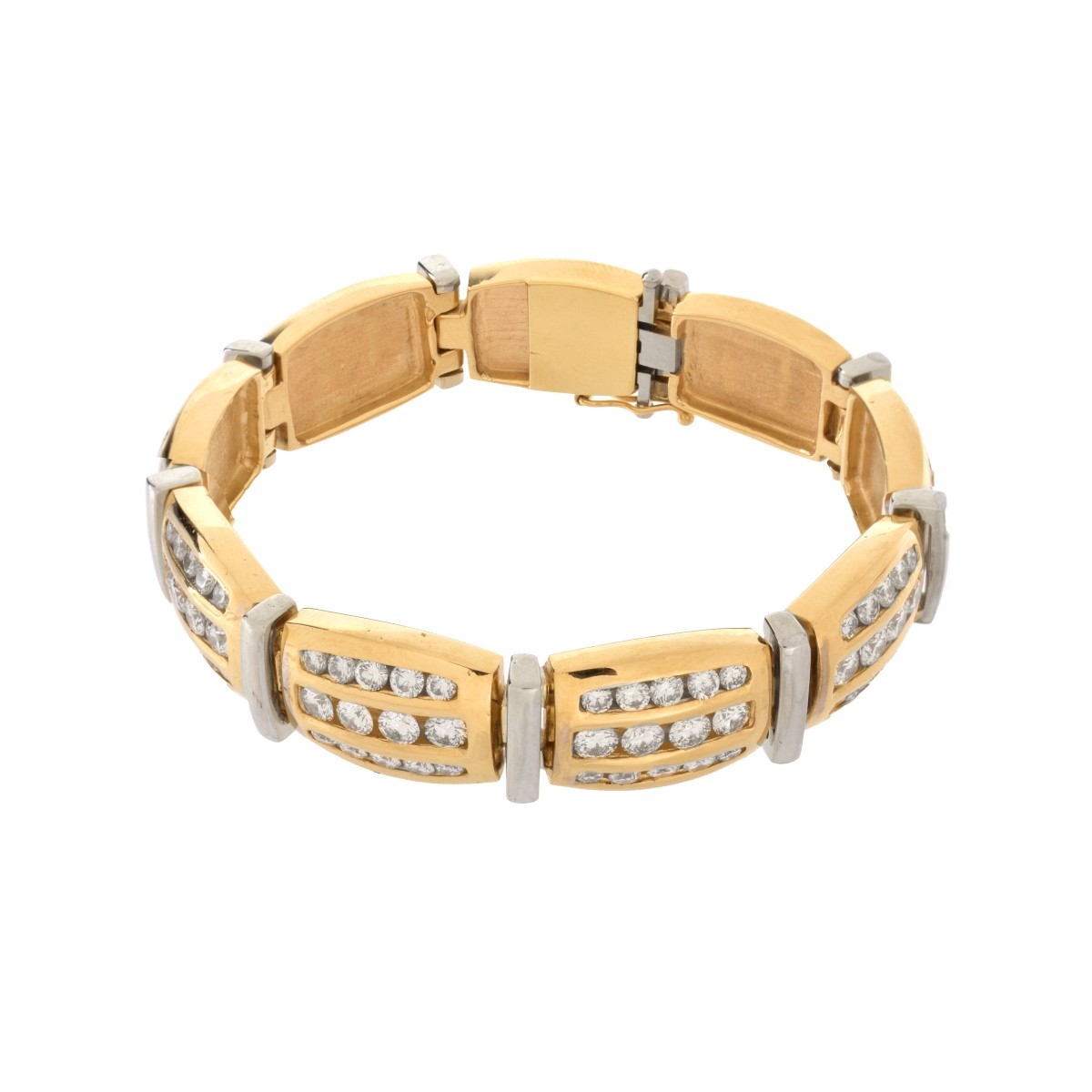 Approx. 11.0 Carat TW One Hundred Twenty Six Round Brilliant Cut Diamond and 14 Karat Yellow Gold Link Bracelet. Diamonds H-I color, VS-SI clarity. Measures 6-3/4" L, 7/16" W. Approx. weight: 61.88 grams. Condition: Very good condition. For additional information and/or WhatsApp video please contact our resident GIA Graduate Gemologist, Russ Kodner at 954.650.5030 Estimate: $6000.00 - $8000.00 Domestic Shipping: $32.00