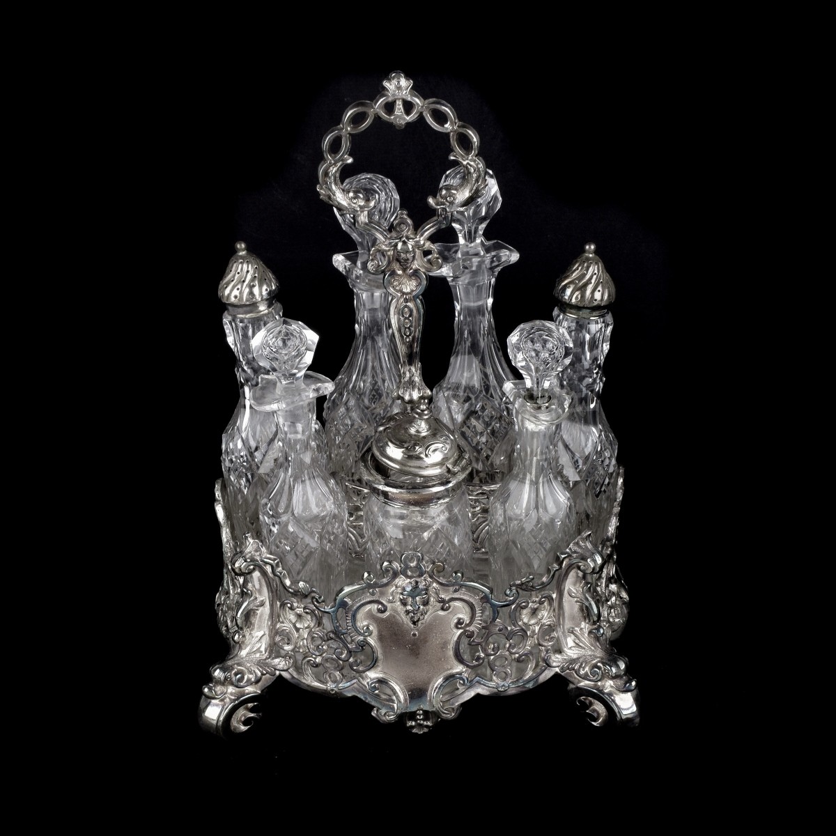 Antique Victorian Silverplate Cruet Set. Consists of seven cut crystal bottle. Marked "EP" on the base. Pierced apron with figural mask relief. Overall measures 12-3/8" x 9". Tallest bottle measures 8-1/2". Condition: Stand needs a routine cleaning. One bottle has some wear at the base of the stopper, others may have a few nicks and scuffs to the base. Estimate: $100.00 - $150.00 Domestic Shipping: $76.00