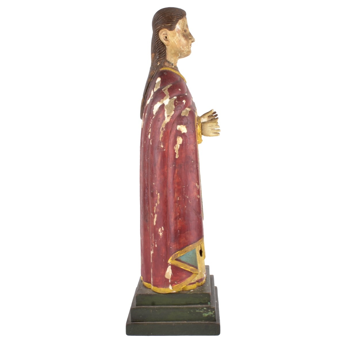 19th Century Polychrome Wood Carved Santos Figure on Plinth Base. Measures 17-1/4" x 7". Condition: Surface wear, rubbing and scratches, wear to the fingers. Estimate: $300.00 - $500.00 Domestic Shipping: $92.00