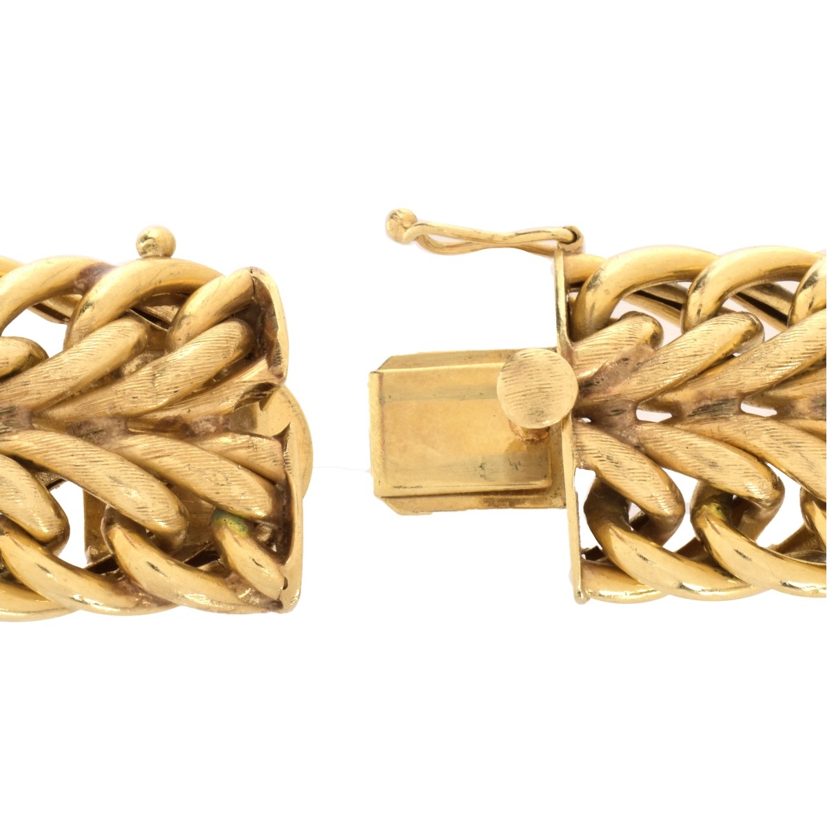 Vintage 14 Karat Yellow Gold Wide Charm Bracelet. Stamped 14K. Measures 7-1/2" L, 1/2" W. Approx. weight: 54.87 grams. Condition: Very good vintage pre-owned condition. Estimate: $1000.00 - $1500.00 Domestic Shipping: $30.00