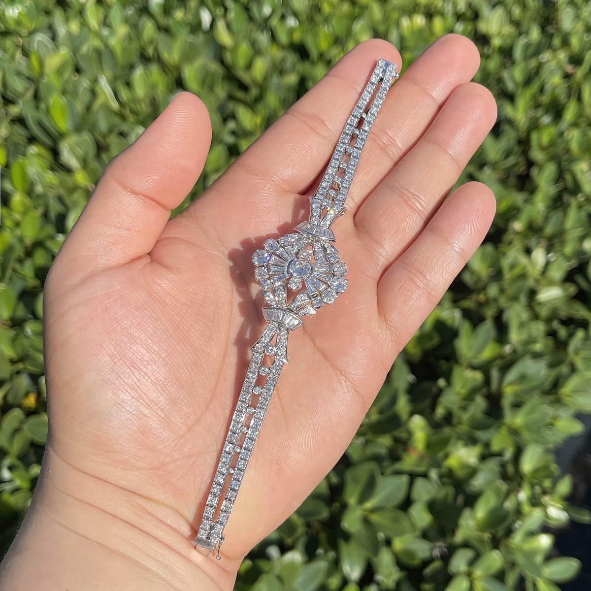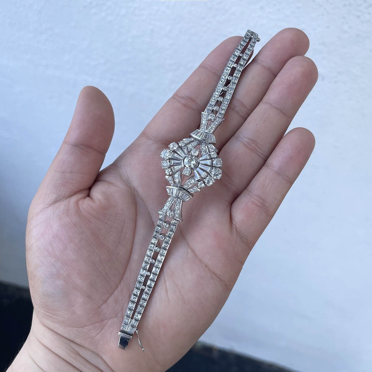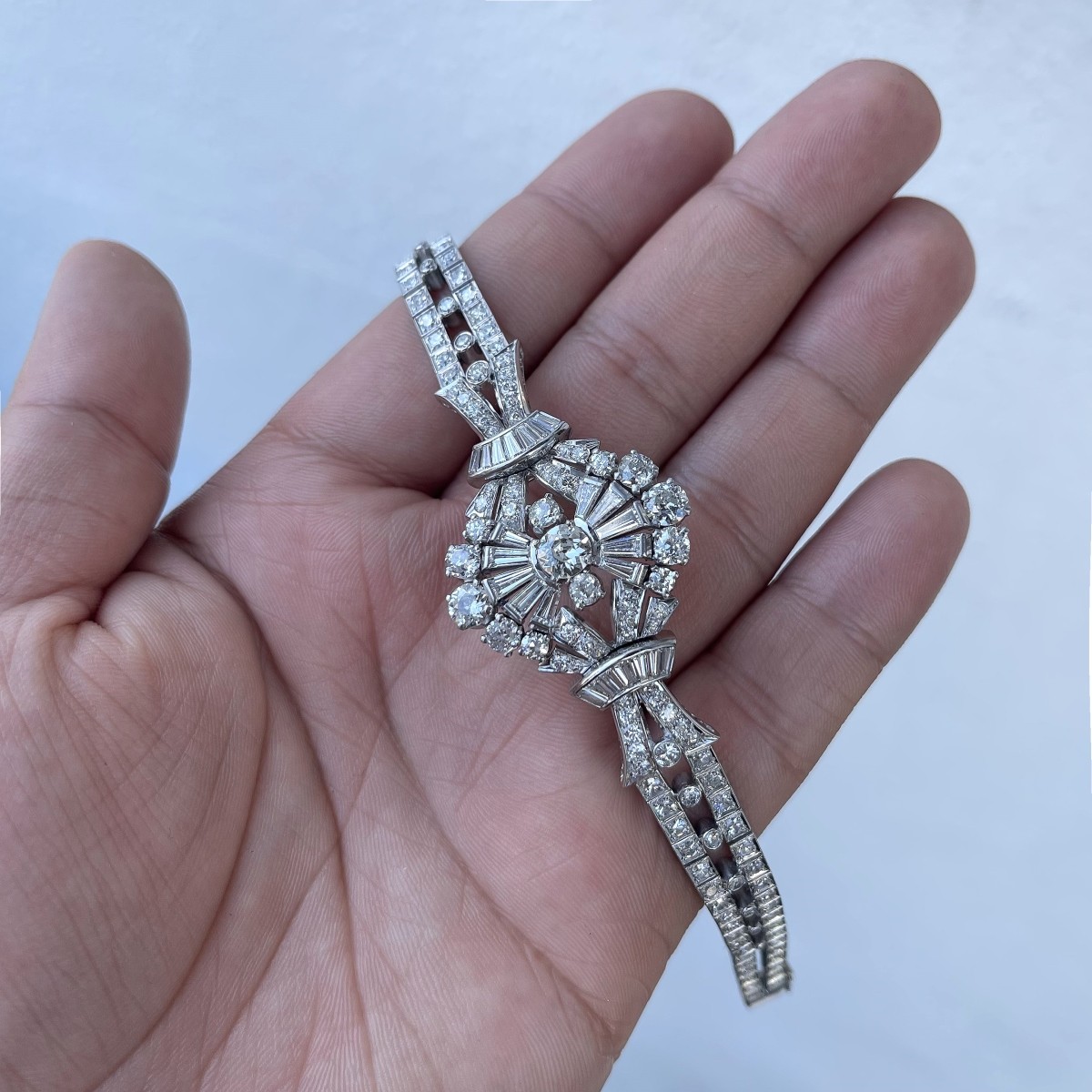 Vintage Approx. 11.50 Carat TW Old European Cut, Round Brilliant Cut and Baguette Cut Diamond and Platinum Bracelet. Set in the center with an approx. .60 carat old European cut diamond. Diamonds G-H color, VS-SI clarity. Measures 6-1/2" L, 1-1/8" W. Approx. weight: 41.88 grams. Condition: Very good condition. For additional information and/or WhatsApp video please contact our resident GIA Graduate Gemologist, Russ Kodner at 954.650.5030 Estimate: $12,000.00 - $15,000.00 Domestic Shipping: $32.00