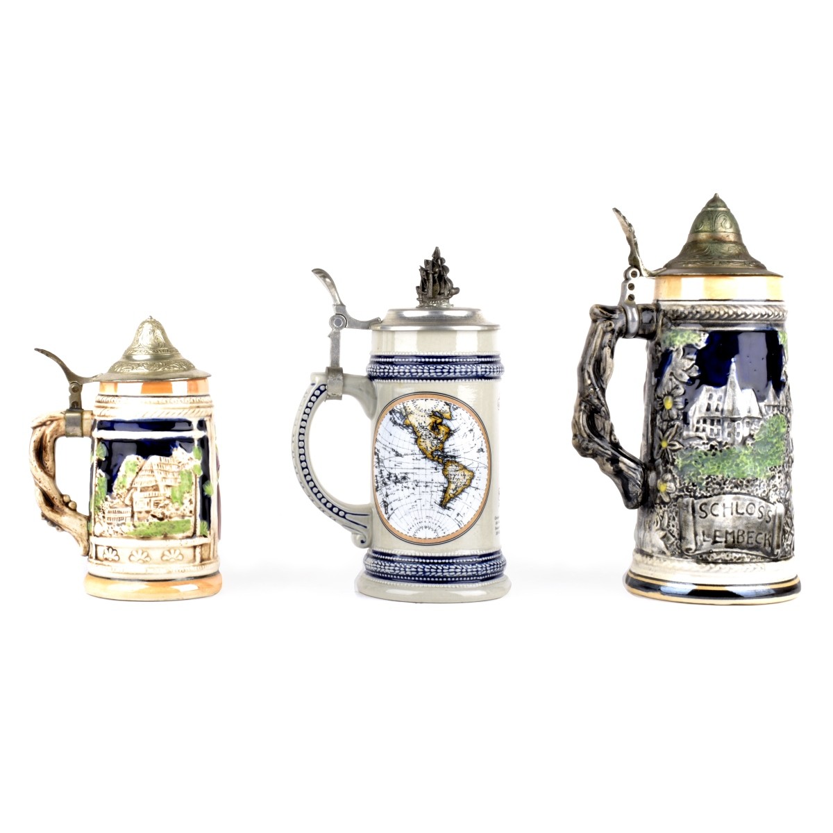 Grouping of Three (3) Vintage Porcelain Steins. Lot includes two German and one Japanese. Tallest measures 10-1/2", smallest measures 7". Condition: Good condition. Estimate: $50.00 - $100.00 Domestic Shipping: $76.00