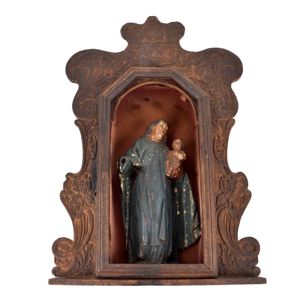 Antique Continental Madonna and Child Wall Hanging Icon in Wood Carved Frame. Measures 20" x 13-1/2". Condition: Rubbing and surface wear, missing right hand. Icon is slightly loose. Estimate: $50.00 - $100.00 Domestic Shipping: Third party