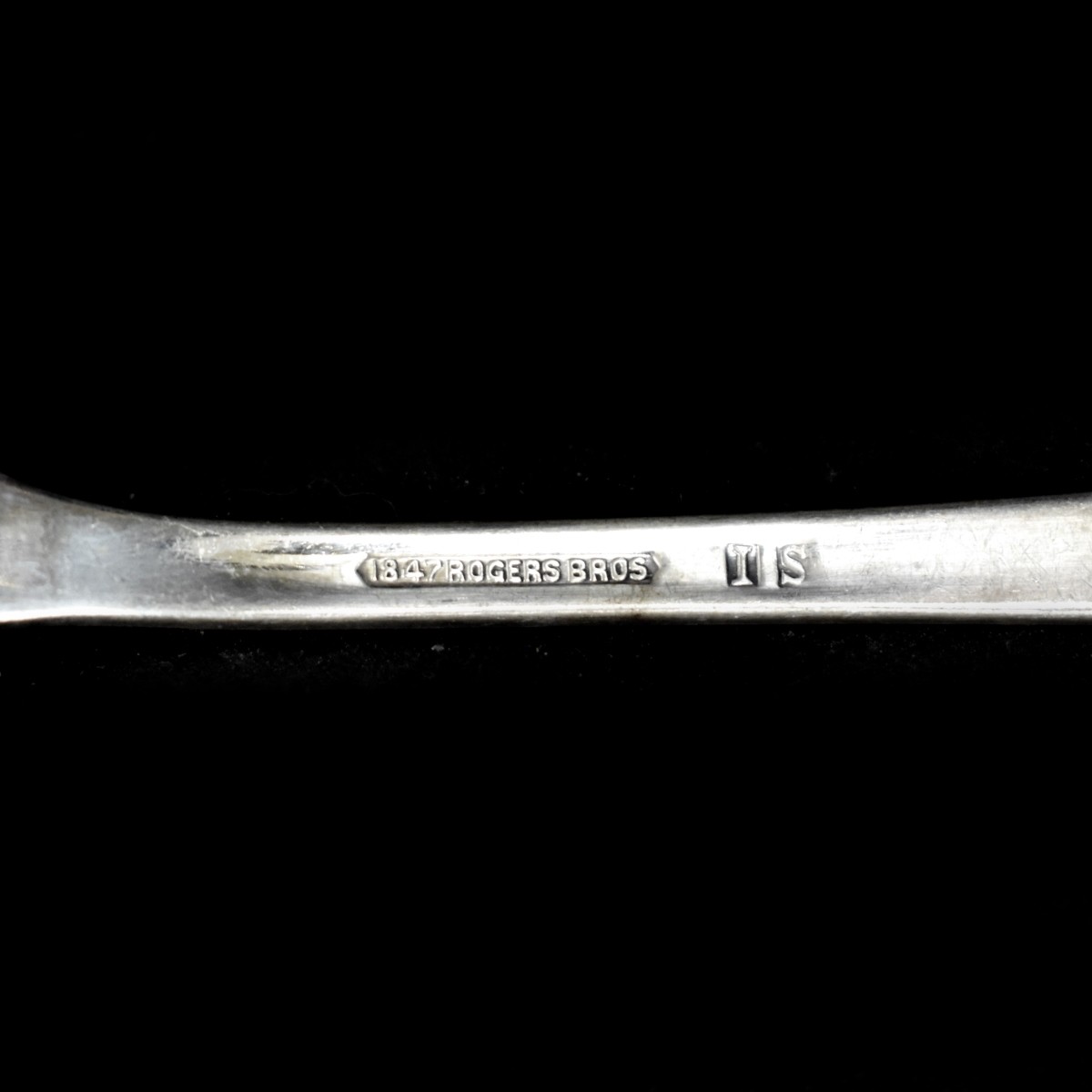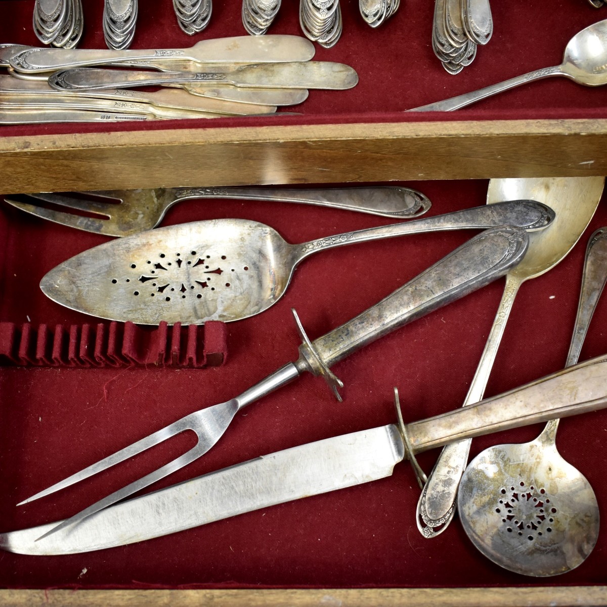 One Hundred and Five (105) Piece Rogers Bros "Lovelace" Silverplate Flatware. Includes: (12) knives measuring 9-1/2", (12) forks measuring 7-3/4', (12) salad forks, (9) cocktail forks, (10) round bowl spoons, (12) ice tea spoons, (23) teaspoons, (8) spreaders, sugar spoon, serving spoon, tomato server, cold meat fork, pierced pie server, and two-piece steak carving set. Signed. Condition: Needs cleaning otherwise good condition. Estimate: $100.00 - $200.00 Domestic Shipping: $95.00