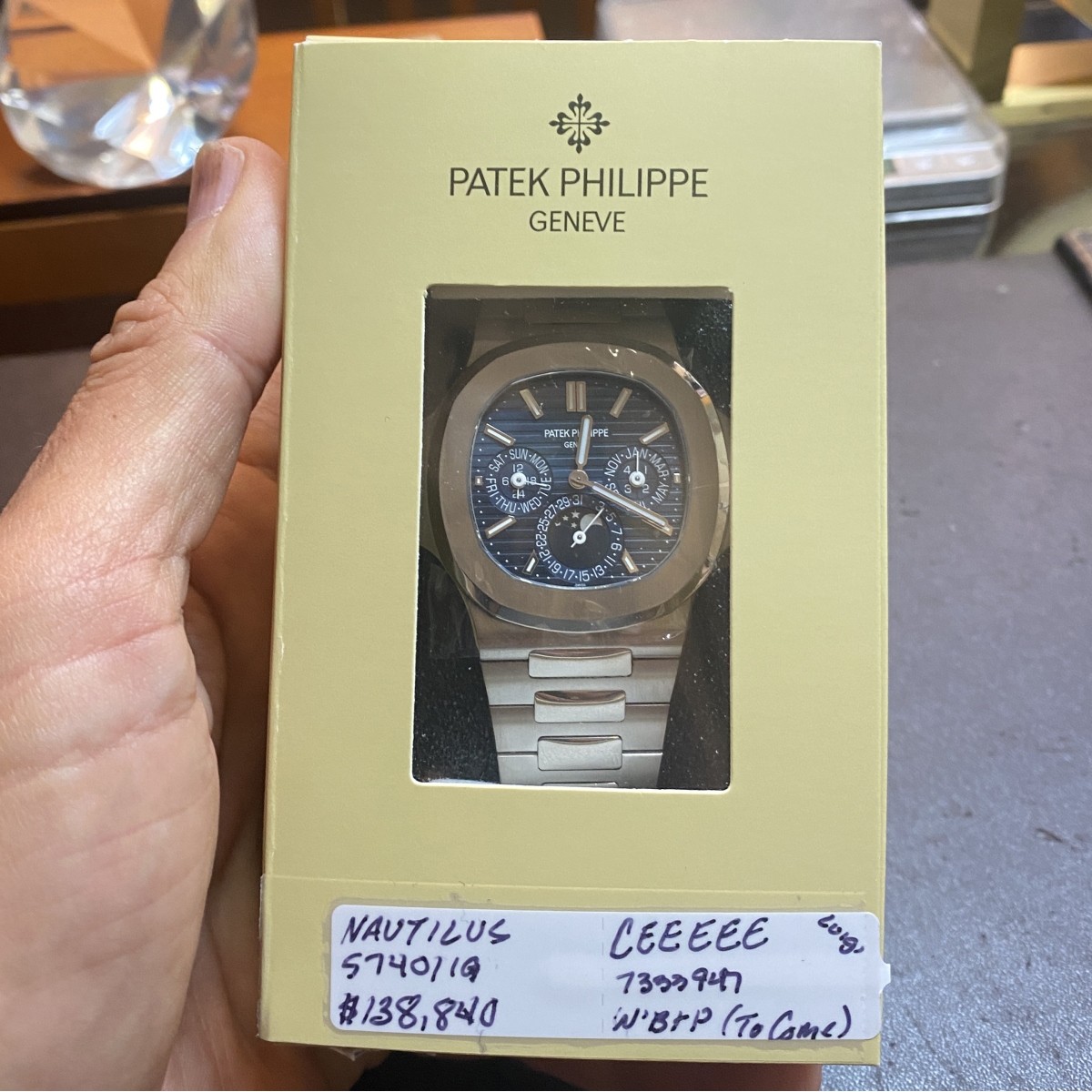 New 2021 Patek Philippe Nautilus Perpetual Calendar 5740/1G-001 18 Karat White Gold Bracelet Watch with Blue Sunburst Dial. Automatic self-winding movement. Case measures 40mm. New and complete with box and papers. Condition: New condition. Please note the gallery does not warranty the running condition of watches. For additional information and/or WhatsApp video please contact our resident GIA Graduate Gemologist, Russ Kodner at 954.650.5030 Estimate: $200,000.00 - $300,000.00 Domestic Shipping: $44.00