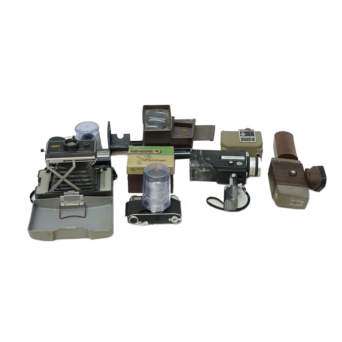 Lot of Assorted Vintage Cameras, Lenses, and Equipment. Lot includes a Yashica Super 40, Kodak Retina Reflex S, Eumig Electric, Bell & Howell Sun Dial, Poloroid Automatic Land Camera, Canon Lens FD 50MM, Pana Vue Automatic, View Master Stereo Scope, Tiffen Adapter Ring #522-G, and Franke & Heidecke filters. Condition: Used condition with wear and defects. Estimate: $50.00 - $150.00 Domestic Shipping: $92.00
