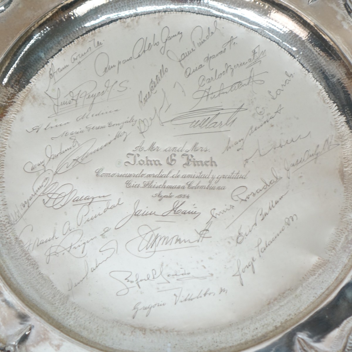 South American 900 Silver Platter. Marked JE 900 on the reverse side. Presentation signatures on center. Measures 19-1/2". Approx. weight: 48.18 troy ounces. Condition: Small dings otherwise good condition. Estimate: $800.00 - $1200.00 Domestic Shipping: Third party