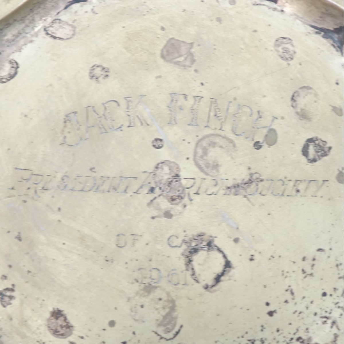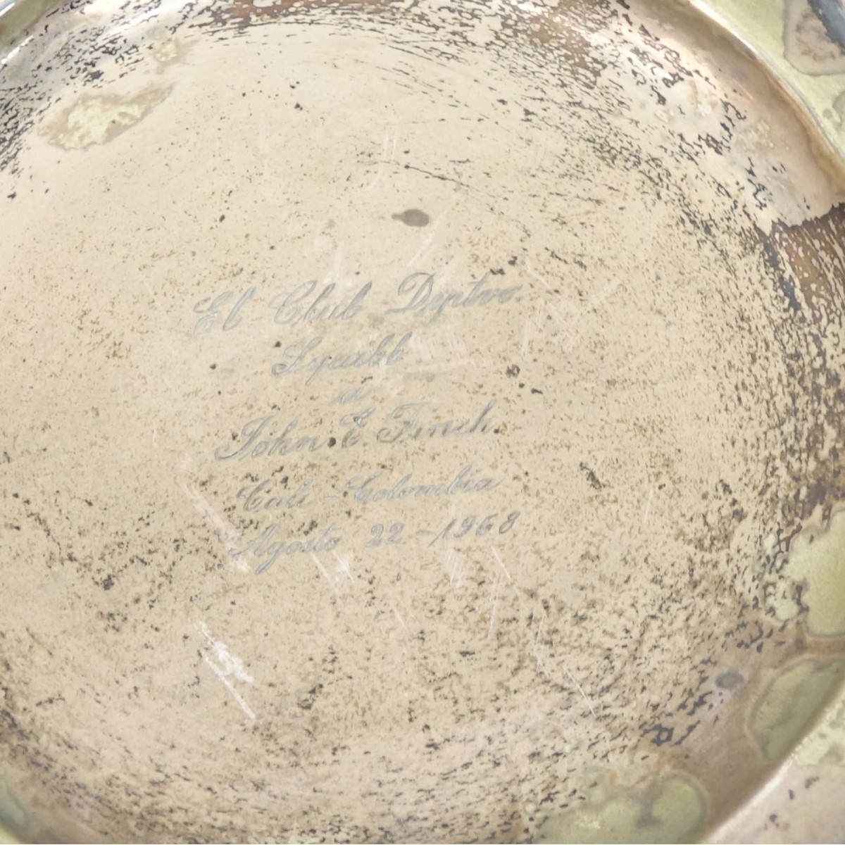 Two (2) Columbian 900 Silver Silver Platters together with a Silver Sombrero. Platters having Columbian cities motif encircling the rim. Platters are marked 900, Sombrero has been tested. Larger platter measures 10-3/4", other measures 9-1/2", Sombrero measures 1-1/4" x 4-3/4". Total approx. weight: 25.43 troy ounces. Condition: Rubbing, needs cleaning otherwise good condition. Estimate: $300.00 - $500.00 Domestic Shipping: $62.00