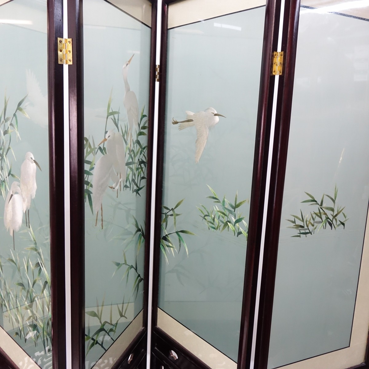 Antique Chinese Silk Embroidered Reticulated Hardwood 6 Panel Screen. Silk is under glass, cranes motif. Measures approx. 74' x 96". Condition: Good condition. Estimate: $500.00 - $2500.00 Domestic Shipping: Third party