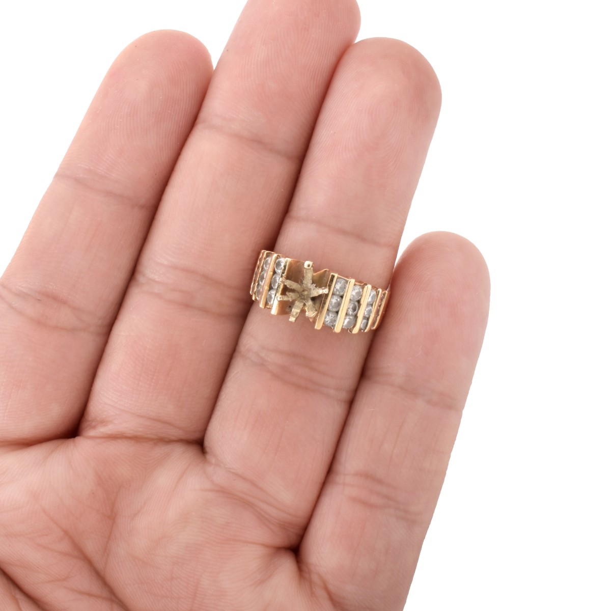 Vintage Diamond and 14 Karat Yellow Gold Wedding Ring. Set in the center with an approx. .50-.60 carat antique pear shape diamond, H color, SI1 clarity. Accented with approx. 1.20 carat TW round brilliant cut diamonds, G-H color, SI1 clarity. Ring size 6-1/2. Approx. weight: 4.45 grams. Condition: Good vintage condition. Out of round. Needs cleaning. Estimate: $300.00 - $500.00 Domestic Shipping: $28.00