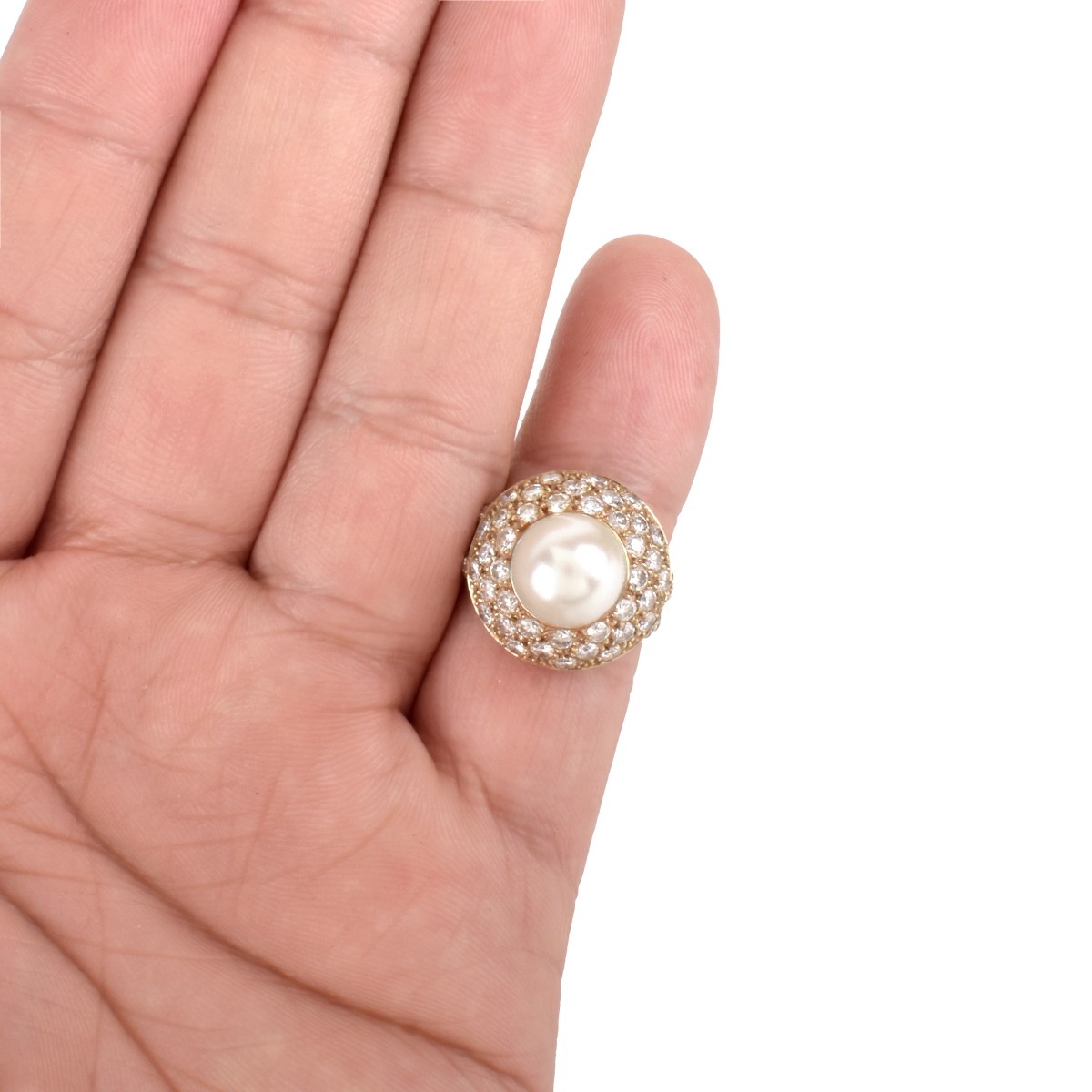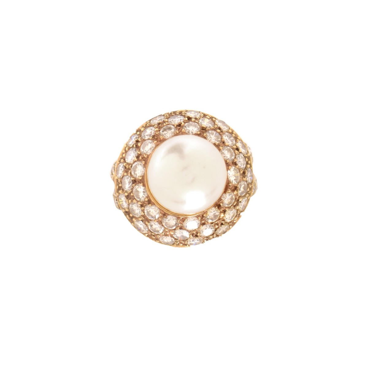 Vintage 10.0mm White Pearl, Approx. 4.0 Carat TW Round Brilliant Cut Diamond and 14 Karat Yellow Gold Dome Ring. Diamonds F-G color, VS1-VS2 clarity. Pearl with good luster and polish. Ring size 4-1/2. Approx. weight: 6.25 grams. Condition: Very good vintage condition. Estimate: $400.00 - $500.00 Domestic Shipping: $28.00