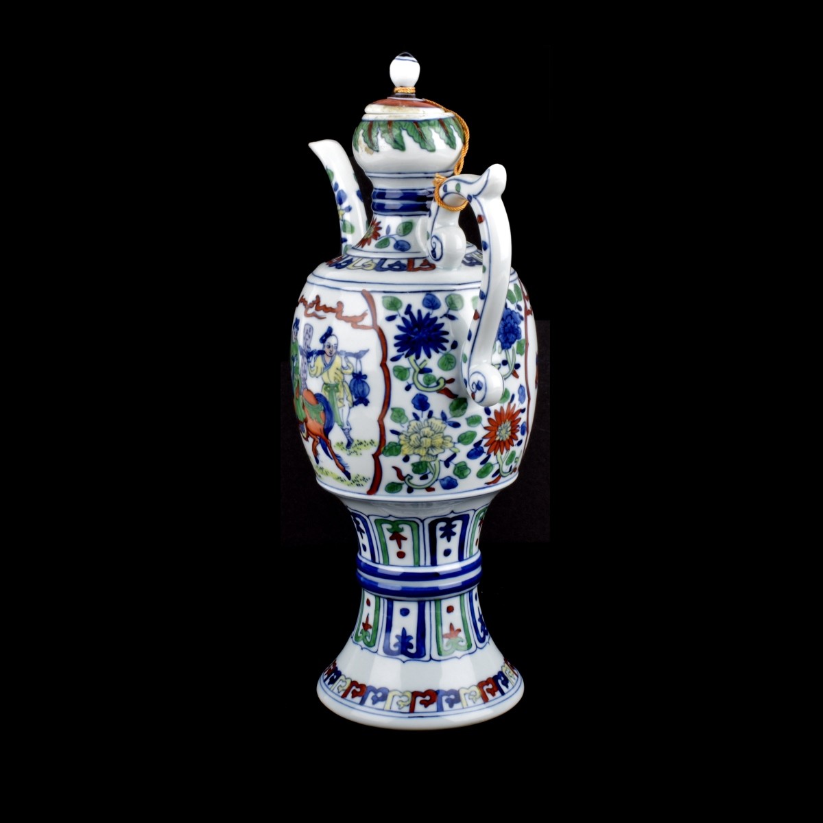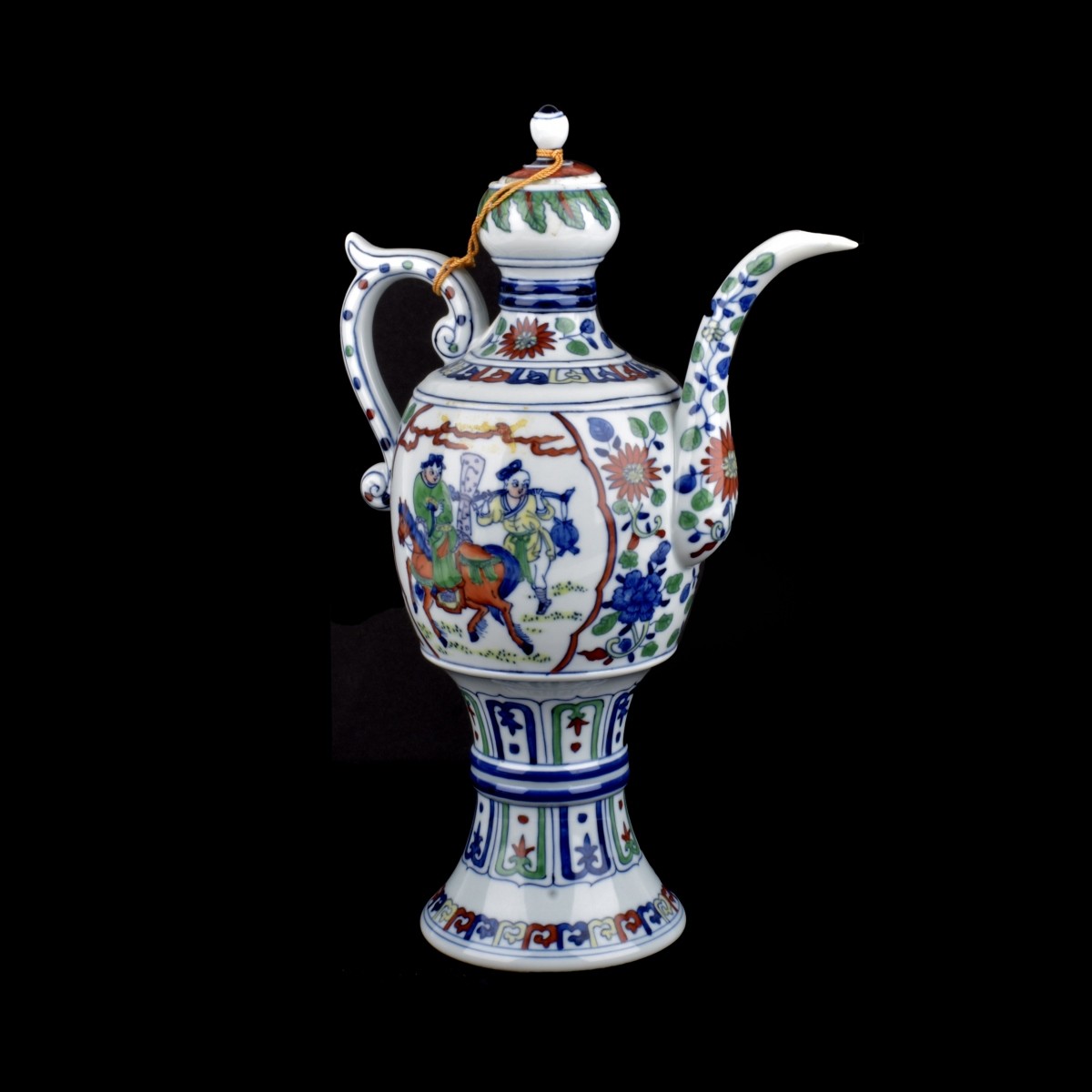 Chinese Doucai Style Porcelain Teapot. Signed. Continuous floral detail with figural motif en center. Measures 11-1/2" x 7-1/2". Condition: Good condition. Estimate: $200.00 - $400.00 Domestic Shipping: $68.00