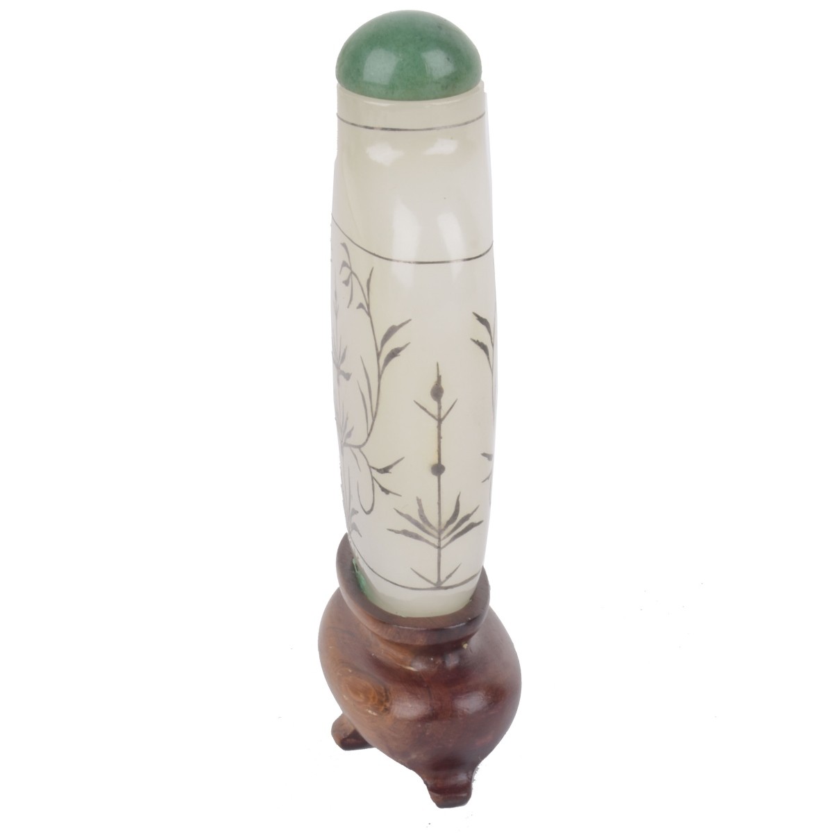 Chinese White Glass Snuff Bottle with Incised Floral Detail and Presented on Wooden Stand. Measures 2-3/4" x 1-1/2" (w/o stand). Condition: Stem is detached otherwise good condition. Estimate: $100.00 - $300.00 Domestic Shipping: $32.00