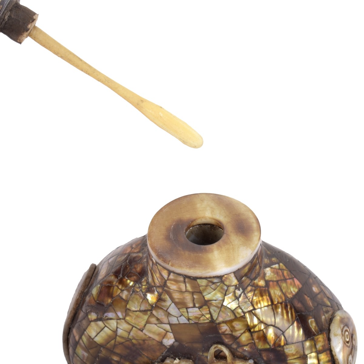 Chinese Mother of Pearl Snuff Bottle on Wooden Stand. Decorated with applied scholars items and mock foo dog handles. Measures 2-1/2" x 2" w/o stand). Condition: good condition. Estimate: $200.00 - $500.00 Domestic Shipping: $36.00