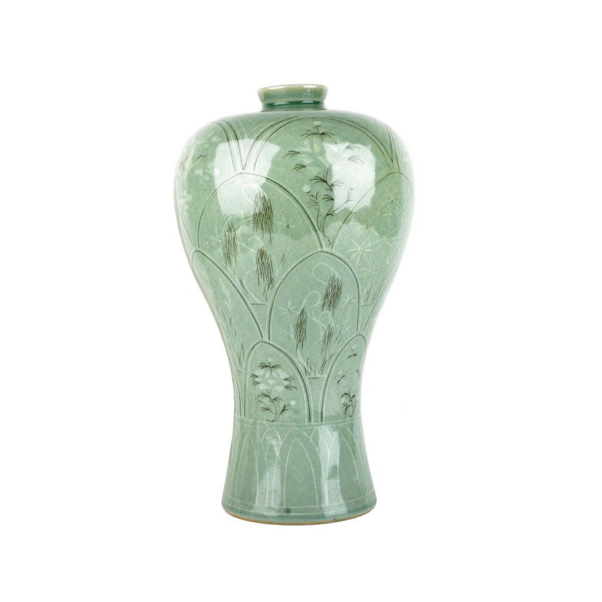 Vintage Korean Celadon Meiping Vase. Signed. Measures 13" x 7". Condition: Crazing otherwise good condition. Estimate: $50.00 - $150.00 Domestic Shipping: $88.00