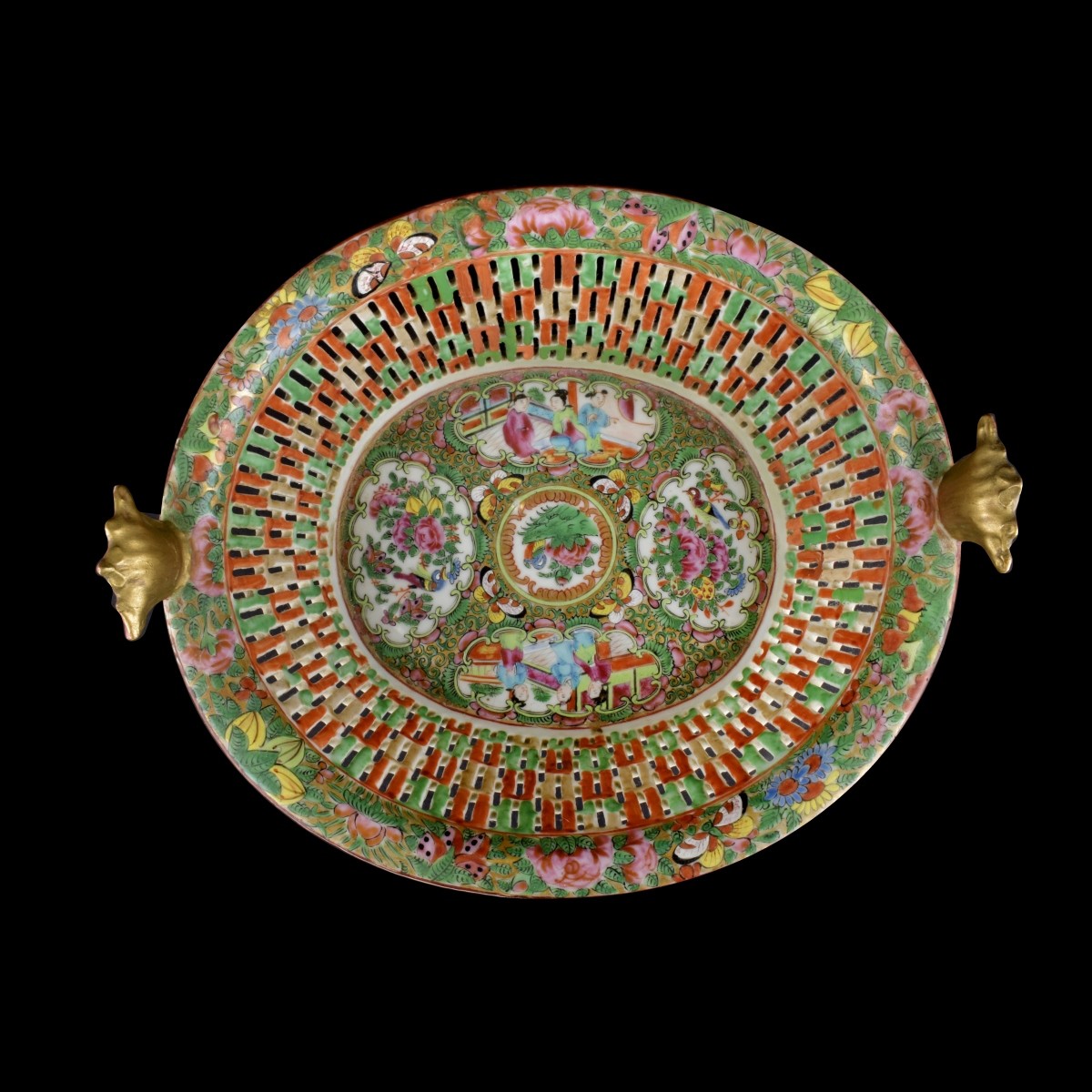 Antique Chinese Rose Mandarin Pierced Center Bowl. Unsigned. Continuous Floral embellishments and figural vignettes. Measures 5-1/2" x 11-1/4". Condition: Repairs to the handle, rubbing otherwise good condition. Estimate: $100.00 - $200.00 Domestic Shipping: $88.00